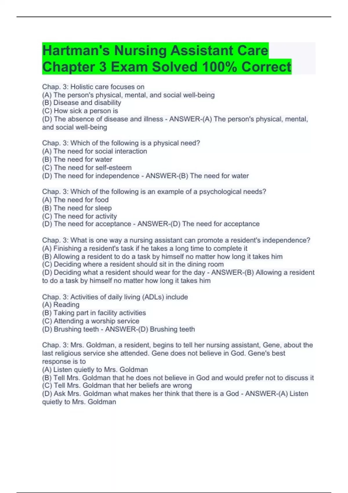 Chap. 3: Holistic care focuses on (A) The person's physical, mental, and social well-being (B) Disease and disability (C) How sick a person is (D) The absence of disease and illness - ANSWER-(A) The person's physical, mental, and social well-being Chap. 3: Which of the following is a physical need? (A) The need for social interaction (B) The need for water (C) The need for self-esteem (D) The need for independence - ANSWER-(B) The need for water Chap. 3: Which of the following is an example of a psychological needs? (A) The need for food (B) The need for sleep (C) The need for activity (D) The need for acceptance - ANSWER-(D) The need for acceptance Chap. 3: What is one way a nursing assistant can promote a resident's independence? (A) Finishing a resident's task if he takes a long time to complete it (B) Allowing a resident to do a task by himself no matter how long it takes him (C) Deciding where a resident should sit in the dining room (D) Deciding what a resident should wear for the day - ANSWER-(B) Allowing a resident to do a task by himself no matter how long it takes him Chap. 3: Activities of daily living (ADLs) include (A) Reading (B) Taking part in facility activities (C) Attending a worship service (D) Brushing teeth - ANSWER-(D) Brushing teeth Chap. 3: Mrs. Goldman, a resident, begins to tell her nursing assistant, Gene, about the last religious service she attended. Gene does not believe in God. Gene's best response is to (A) Listen quietly to Mrs. Goldman (B) Tell Mrs. Goldman that he does not believe in God and would prefer not to discuss it (C) Tell Mrs. Goldman that her beliefs are wrong (D) Ask Mrs. Goldman what makes her think that there is a God - ANSWER-(A) Listen quietly to Mrs. Goldman