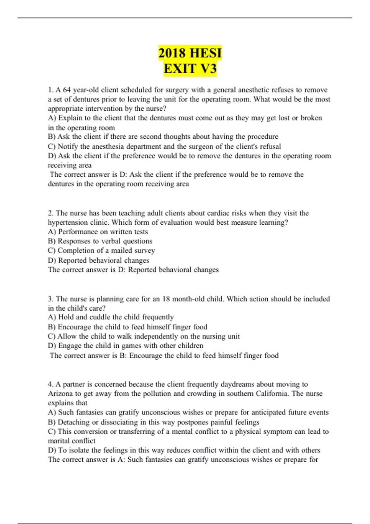 2018 HESI EXIT V3 1. A 64 year-old client scheduled for surgery with a general anesthetic refuses to remove a set of dentures prior to leaving the unit for the operating room. What would be the most appropriate intervention by the nurse? A) Explain to the client that the dentures must come out as they may get lost or broken in the operating room B) Ask the client if there are second thoughts about having the procedure C) Notify the anesthesia department and the surgeon of the client's refusal D) Ask the client if the preference would be to remove the dentures in the operating room receiving area The correct answer is D: Ask the client if the preference would be to remove the dentures in the operating room receiving area 2. The nurse has been teaching adult clients about cardiac risks when they visit the hypertension clinic. Which form of evaluation would best measure learning? A) Performance on written tests B) Responses to verbal questions C) Completion of a mailed survey D) Reported behavioral changes The correct answer is D: Reported behavioral changes 3. The nurse is planning care for an 18 month-old child. Which action should be included in the child's care? A) Hold and cuddle the child frequently B) Encourage the child to feed himself finger food C) Allow the child to walk independently on the nursing unit D) Engage the child in games with other children The correct answer is B: Encourage the child to feed himself finger food 4. A partner is concerned because the client frequently daydreams about moving to Arizona to get away from the pollution and crowding in southern California. The nurse explains that A) Such fantasies can gratify unconscious wishes or prepare for anticipated future events B) Detaching or dissociating in this way postpones painful feelings C) This conversion or transferring of a mental conflict to a physical symptom can lead to marital conflict D) To isolate the feelings in this way reduces conflict within the client and with others The correct answer is A: Such fantasies can gratify unconscious wishes or prepare for anticipated future events