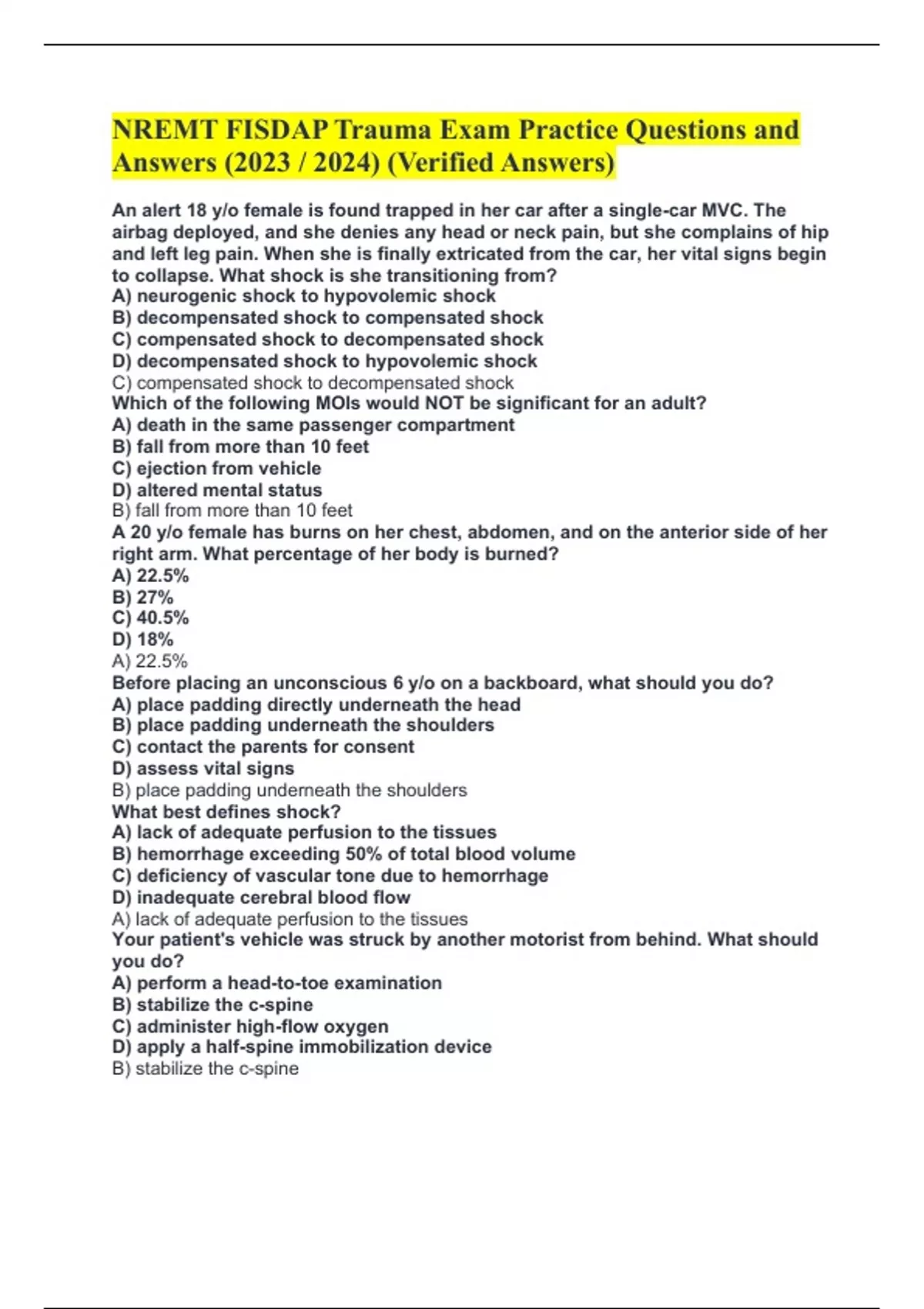 NREMT FISDAP Trauma Exam Practice Questions and Answers (2023 / 2024) (Verified Answers) An alert 18 y/o female is found trapped in her car after a single-car MVC. The airbag deployed, and she denies any head or neck pain, but she complains of hip and left leg pain. When she is finally extricated from the car, her vital signs begin to collapse. What shock is she transitioning from? A) neurogenic shock to hypovolemic shock B) decompensated shock to compensated shock C) compensated shock to decompensated shock D) decompensated shock to hypovolemic shock C) compensated shock to decompensated shock Which of the following MOIs would NOT be significant for an adult? A) death in the same passenger compartment B) fall from more than 10 feet C) ejection from vehicle D) altered mental status B) fall from more than 10 feet A 20 y/o female has burns on her chest, abdomen, and on the anterior side of her right arm. What percentage of her body is burned? A) 22.5% B) 27% C) 40.5% D) 18% A) 22.5%
