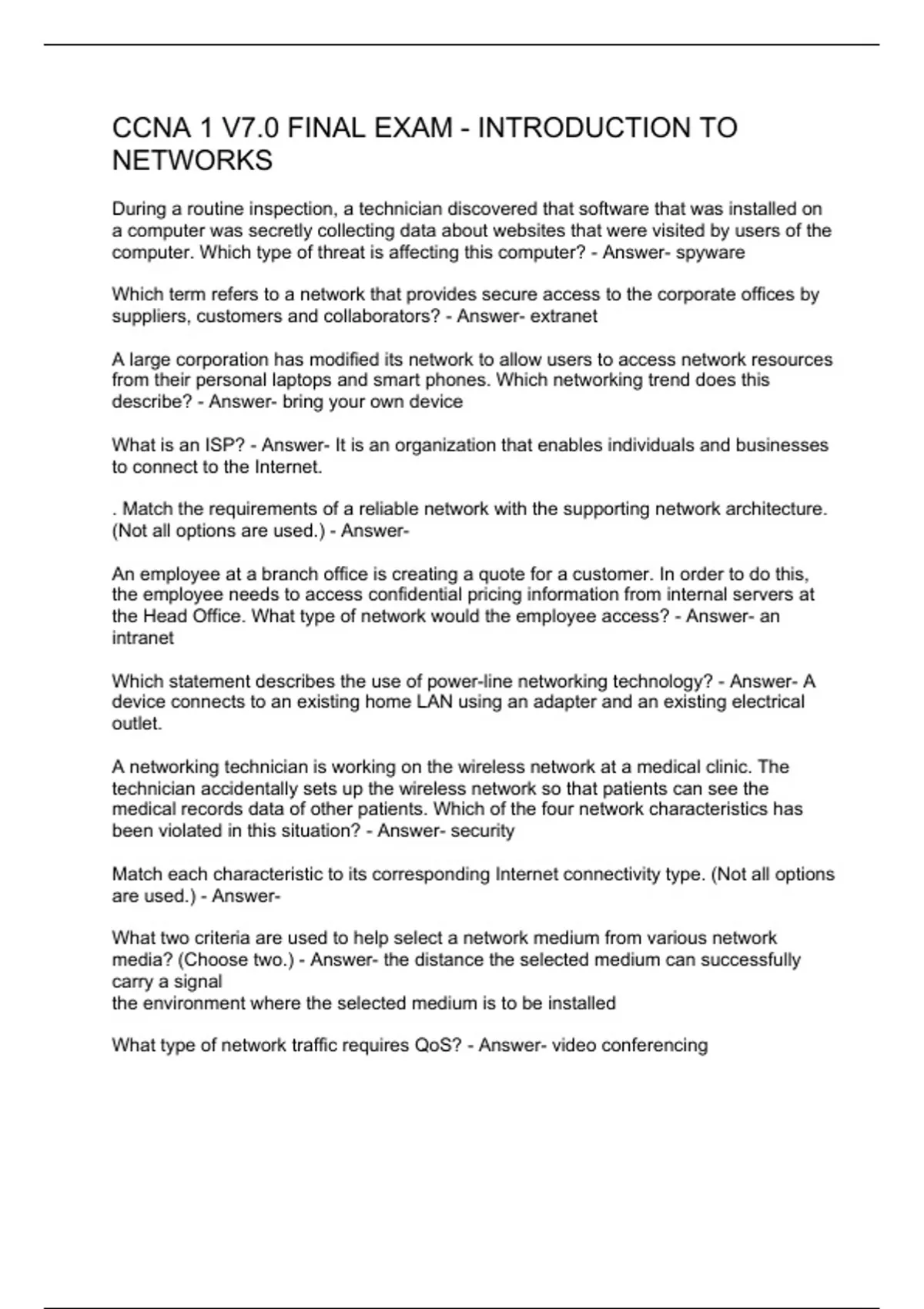 During a routine inspection, a technician discovered that software that was installed on a computer was secretly collecting data about websites that were visited by users of the computer. Which type of threat is affecting this computer? - Answer- spyware Which term refers to a network that provides secure access to the corporate offices by suppliers, customers and collaborators? - Answer- extranet A large corporation has modified its network to allow users to access network resources from their personal laptops and smart phones. Which networking trend does this describe? - Answer- bring your own device What is an ISP? - Answer- It is an organization that enables individuals and businesses to connect to the Internet. . Match the requirements of a reliable network with the supporting network architecture. (Not all options are used.) - Answer- An employee at a branch office is creating a quote for a customer. In order to do this, the employee needs to access confidential pricing information from internal servers at the Head Office. What type of network would the employee access? - Answer- an intranet Which statement describes the use of power-line networking technology? - Answer- A device connects to an existing home LAN using an adapter and an existing electrical outlet. A networking technician is working on the wireless network at a medical clinic. The technician accidentally sets up the wireless network so that patients can see the medical records data of other patients. Which of the four network characteristics has been violated in this situation? - Answer- security Match each characteristic to its corresponding Internet connectivity type. (Not all options are used.) - Answer- What two criteria are used to help select a network medium from various network media? (Choose two.) - Answer- the distance the selected medium can successfully carry a signal the environment where the selected medium is to be installed What type of network traffic requires QoS? - Answer- video conferencing A user is implementin