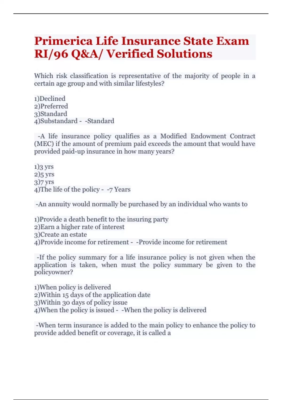 Primerica Life Insurance State Exam RI/96 Q&A/ Verified Solutions