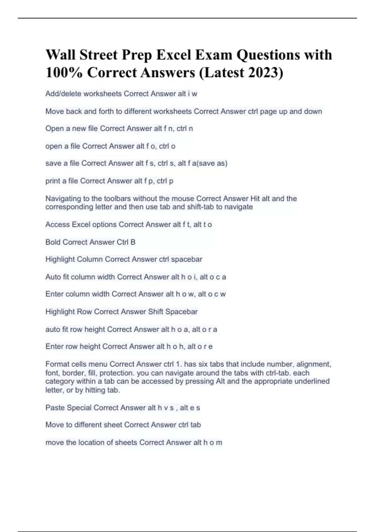 Add/delete worksheets Correct Answer alt i w Move back and forth to different worksheets Correct Answer ctrl page up and down Open a new file Correct Answer alt f n, ctrl n open a file Correct Answer alt f o, ctrl o save a file Correct Answer alt f s, ctrl s, alt f a(save as) print a file Correct Answer alt f p, ctrl p Navigating to the toolbars without the mouse Correct Answer Hit alt and the corresponding letter and then use tab and shift-tab to navigate Access Excel options Correct Answer alt f t, alt t o Bold Correct Answer Ctrl B Highlight Column Correct Answer ctrl spacebar Auto fit column width Correct Answer alt h o i, alt o c a Enter column width Correct Answer alt h o w, alt o c w Highlight Row Correct Answer Shift Spacebar auto fit row height Correct Answer alt h o a, alt o r a Enter row height Correct Answer alt h o h, alt o r e Format cells menu Correct Answer ctrl 1. has six tabs that include number, alignment, font, border, fill, protection. you can navigate around the tabs with ctrl-tab. each category within a tab can be accessed by pressing Alt and the appropriate underlined letter, or by hitting tab. Paste Special Correct Answer alt h v s , alt e s Move to different sheet Correct Answer ctrl tab move the location of sheets Correct Answer alt h o m