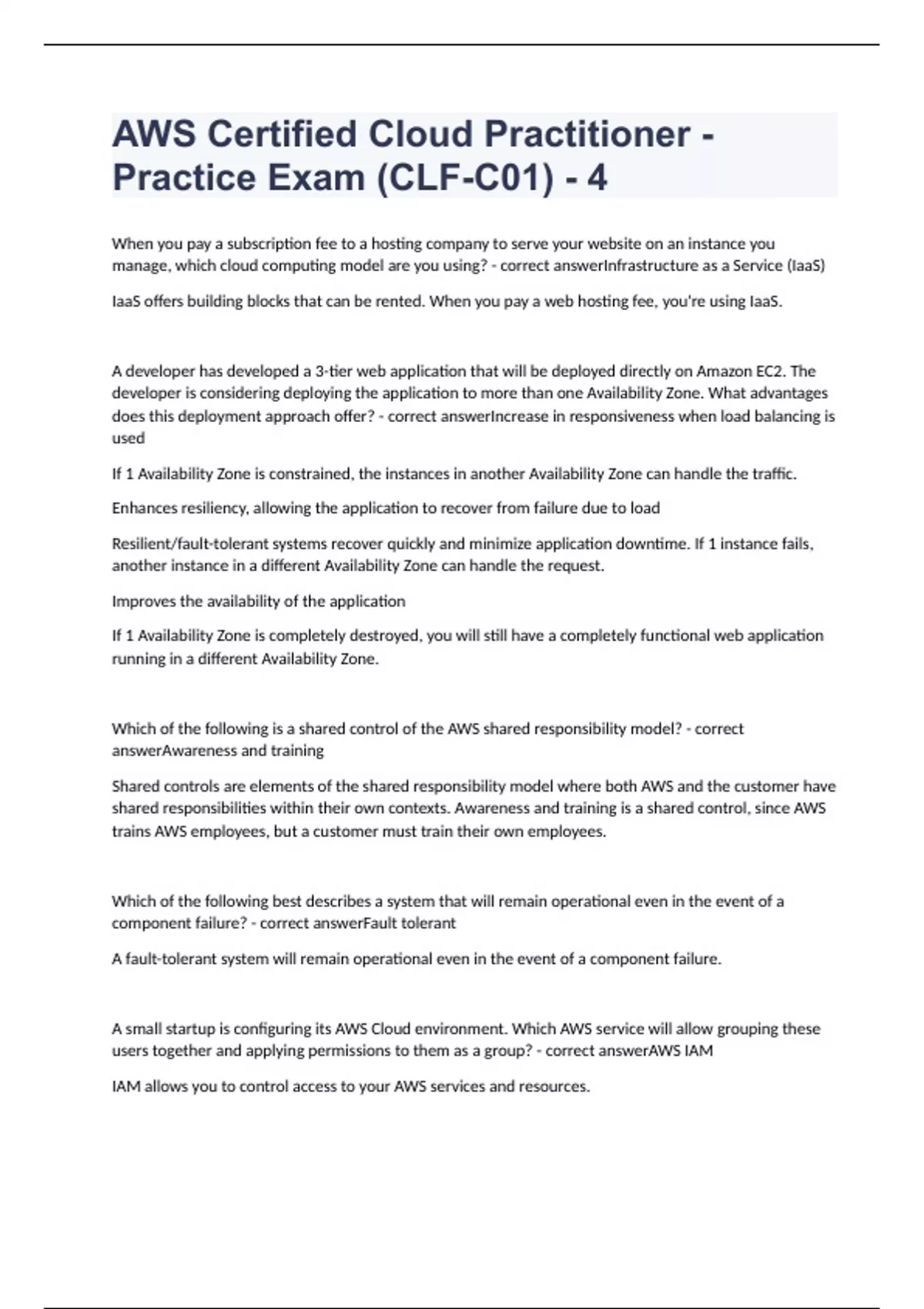 When you pay a subscription fee to a hosting company to serve your website on an instance you manage, which cloud computing model are you using? - correct answerInfrastructure as a Service (IaaS) IaaS offers building blocks that can be rented. When you pay a web hosting fee, you're using IaaS. A developer has developed a 3-tier web application that will be deployed directly on Amazon EC2. The developer is considering deploying the application to more than one Availability Zone. What advantages does this deployment approach offer? - correct answerIncrease in responsiveness when load balancing is used If 1 Availability Zone is constrained, the instances in another Availability Zone can handle the traffic. Enhances resiliency, allowing the application to recover from failure due to load Resilient/fault-tolerant systems recover quickly and minimize application downtime. If 1 instance fails, another instance in a different Availability Zone can handle the request. Improves the availability of the application If 1 Availability Zone is completely destroyed, you will still have a completely functional web application running in a different Availability Zone. Which of the following is a shared control of the AWS shared responsibility model? - correct answerAwareness and training Shared controls are elements of the shared responsibility model where both AWS and the customer have shared responsibilities within their own contexts. Awareness and training is a shared control, since AWS trains AWS employees, but a customer must train their own employees. Which of the following best describes a system that will remain operational even in the event of a component failure? - correct answerFault tolerant A fault-tolerant system will remain operational even in the event of a component failure. A small startup is configuring its AWS Cloud environment. Which AWS service will allow grouping these users together and applying permissions to them as a group? - correct answerAWS IAM IAM allows you to control access to your AWS services and resources. What does a developer need in order to log in to an EC2 instance via SSH from their local machine? - correct answerPrivate key A key pair, consisting of a private key and a public key, is a set of security credentials you use to prove your identity when connecting to an instance. You store the private key locally typically as a pem file. SSH client An SSH client is a program that allows establishing a secure connection from your local laptop to an EC2 instance. ublic key A key pair, consisting of a private key and a public key, is a set of security credentials you use to prove your identity when connecting to an instance. Amazon EC2 stores the public key. What is the recommended way to give your applications running in EC2 permission to other AWS resources? - correct answerCreate an IAM role with appropriate permissions and assign it to the instance. You should use IAM roles wherever possible to enable applications running on EC2 instances to access other AWS resources. This is the most secure method to do so. Which of the following are programmatic access types enabling users to interact with AWS services? - correct answerAPI calls IAM users can make API calls for programmatic access to AWS services AWS SDKs