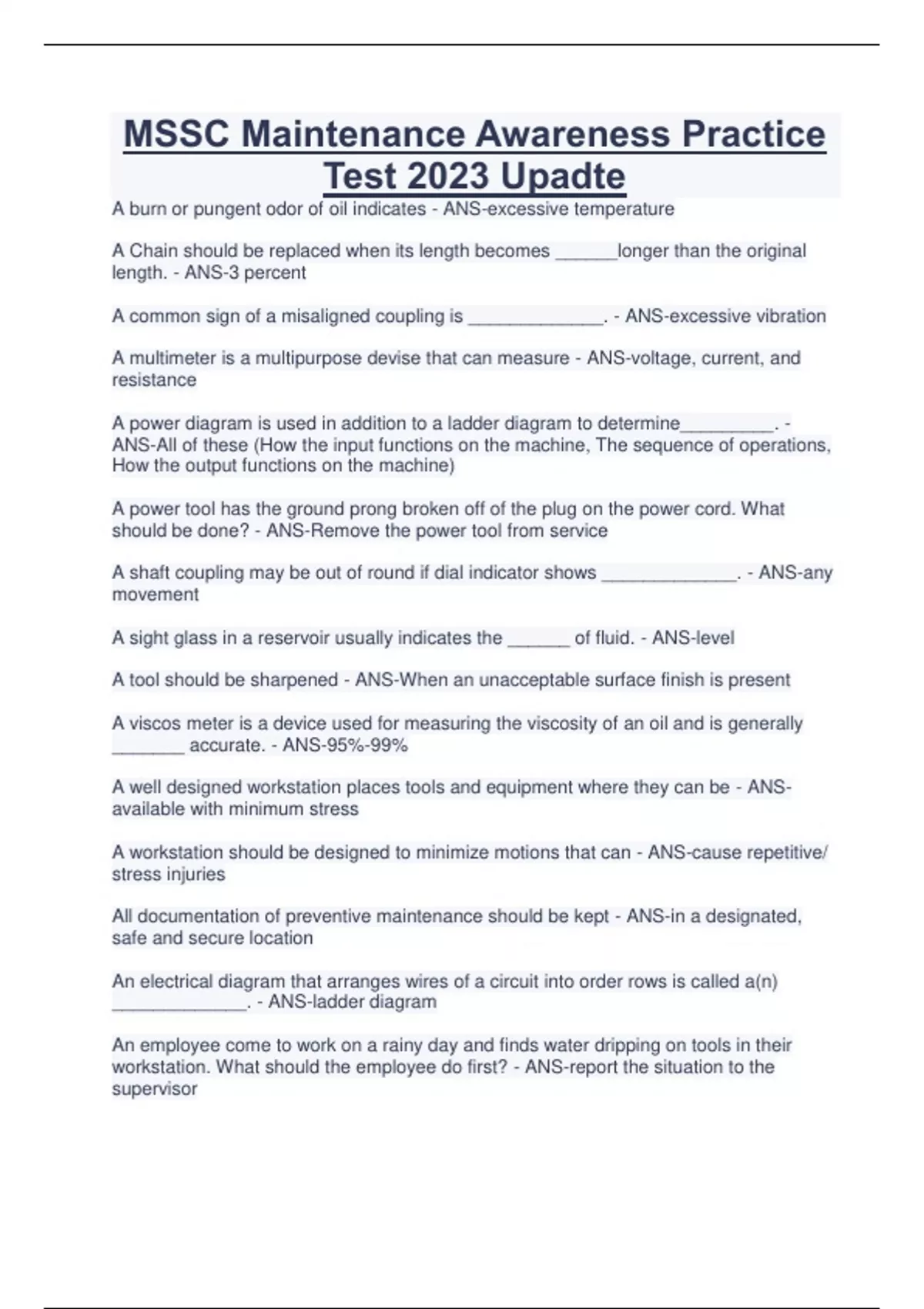 MSSC Maintenance Awareness Practice Test 2023 Upadte A burn or pungent odor of oil indicates - ANS-excessive temperature A Chain should be replaced when its length becomes ______longer than the original length. - ANS-3 percent A common sign of a misaligned coupling is _____________. - ANS-excessive vibration A multimeter is a multipurpose devise that can measure - ANS-voltage, current, and resistance A power diagram is used in addition to a ladder diagram to determine_________. - ANS-All of these (How the input functions on the machine, The sequence of operations, How the output functions on the machine) A power tool has the ground prong broken off of the plug on the power cord. What should be done? - ANS-Remove the power tool from service A shaft coupling may be out of round if dial indicator shows _____________. - ANS-any movement A sight glass in a reservoir usually indicates the ______ of fluid. - ANS-level A tool should be sharpened - ANS-When an unacceptable surface finish is present A viscos meter is a device used for measuring the viscosity of an oil and is generally _______ accurate. - ANS-95%-99% A well designed workstation places tools and equipment where they can be - ANSavailable with minimum stress A workstation should be designed to minimize motions that can - ANS-cause repetitive/ stress injuries All documentation of preventive maintenance should be kept - ANS-in a designated, safe and secure location An electrical diagram that arranges wires of a circuit into order rows is called a(n) _____________. - ANS-ladder diagram An employee come to work on a rainy day and finds water dripping on tools in their workstation. What should the employee do first? - Continues...