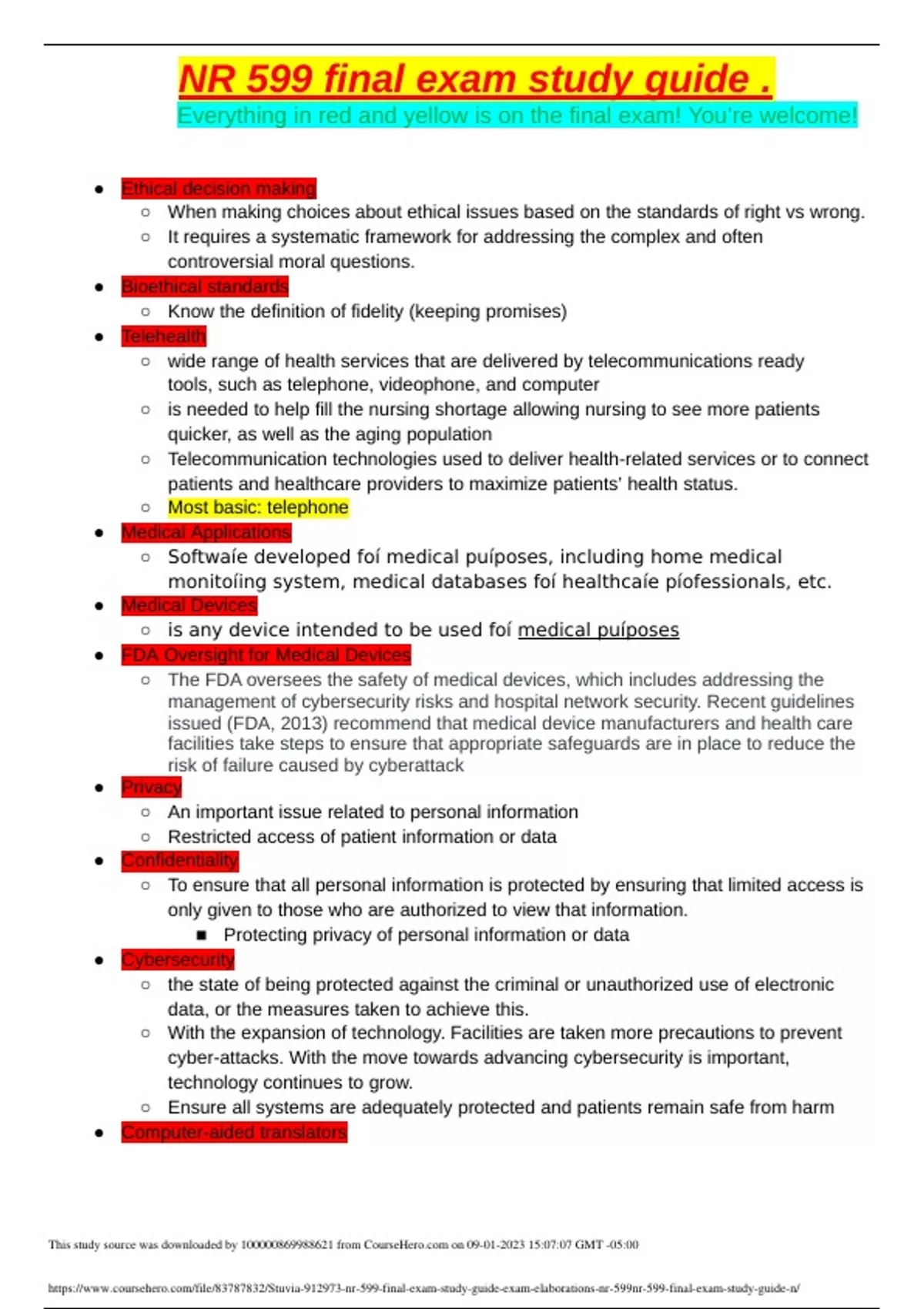 ● Ethical decision making ○ When making choices about ethical issues based on the standards of right vs wrong. ○ It requires a systematic framework for addressing the complex and often controversial moral questions. ● Bioethical standards ○ Know the definition of fidelity (keeping promises) ● Telehealth ○ wide range of health services that are delivered by telecommunications ready tools, such as telephone, videophone, and computer ○ is needed to help fill the nursing shortage allowing nursing to see more patients quicker, as well as the aging population ○ Telecommunication technologies used to deliver health-related services or to connect patients and healthcare providers to maximize patients’ health status. ○ Most basic: telephone ● Medical Applications ○ Softwaíe developed foí medical puíposes, including home medical monitoíing system, medical databases foí healthcaíe píofessionals, etc. ● Medical Devices ○ is any device intended to be used foí medical puíposes ● FDA Oversight for Medical Devices ○ The FDA oversees the safety of medical devices, which includes addressing the management of cybersecurity risks and hospital network security. Recent guidelines issued (FDA, 2013) recommend that medical device manufacturers and health care facilities take steps to ensure that appropriate safeguards are in place to reduce the risk of failure caused by cyberattack ● Privacy ○ An important issue related to personal information ○ Restricted access of patient information or data ● Confidentiality ○ To ensure that all personal information is protected by ensuring that limited access is only given to those who are authorized to view that information. ■ Protecting privacy of personal information or data ● Cybersecurity ○ the state of being protected against the criminal or unauthorized use of electronic data, or the measures taken to achieve this. ○ With the expansion of technology. Facilities are taken more precautions to prevent cyber-attacks. With the move towards advancing cybersecurity is important, technology continues to grow. ○ Ensure all systems are adequately protected and patients remain safe from harm