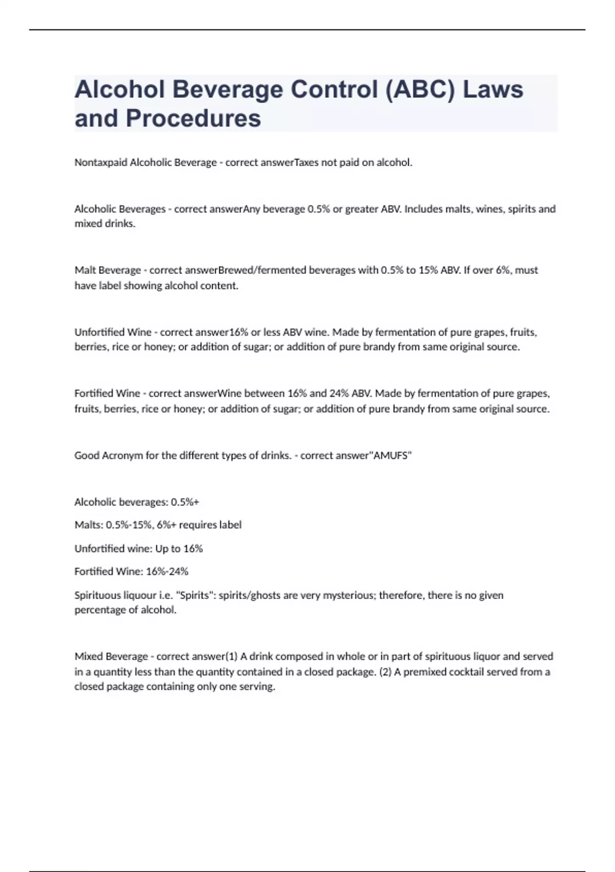 Nontaxpaid Alcoholic Beverage - correct answerTaxes not paid on alcohol. Alcoholic Beverages - correct answerAny beverage 0.5% or greater ABV. Includes malts, wines, spirits and mixed drinks. Malt Beverage - correct answerBrewed/fermented beverages with 0.5% to 15% ABV. If over 6%, must have label showing alcohol content. Unfortified Wine - correct answer16% or less ABV wine. Made by fermentation of pure grapes, fruits, berries, rice or honey; or addition of sugar; or addition of pure brandy from same original source. Fortified Wine - correct answerWine between 16% and 24% ABV. Made by fermentation of pure grapes, fruits, berries, rice or honey; or addition of sugar; or addition of