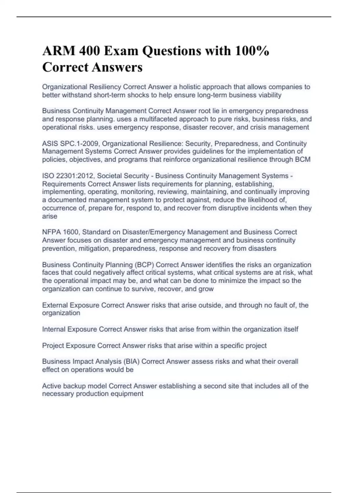 Organizational Resiliency Correct Answer a holistic approach that allows companies to better withstand short-term shocks to help ensure long-term business viability Business Continuity Management Correct Answer root lie in emergency preparedness and response planning. uses a multifaceted approach to pure risks, business risks, and operational risks. uses emergency response, disaster recover, and crisis management ASIS SPC.1-2009, Organizational Resilience: Security, Preparedness, and Continuity Management Systems Correct Answer provides guidelines for the implementation of policies, objectives, and programs that reinforce organizational resilience through BCM ISO 22301:2012, Societal Security - Business Continuity Management Systems - Requirements Correct Answer lists requirements for planning, establishing, implementing, operating, monitoring, reviewing, maintaining, and continually improving a documented management system to protect against, reduce the likelihood of, occurrence of, prepare for, respond to, and recover from disruptive incidents when they arise NFPA 1600, Standard on Disaster/Emergency Management and Business Correct Answer focuses on disaster and emergency management and business continuity prevention, mitigation, preparedness, response and recovery from disasters Business Continuity Planning (BCP) Correct Answer identifies the risks an organization faces that could negatively affect critical systems, what critical systems are at risk, what the operational impact may be, and what can be done to minimize the impact so the organization can continue to survive, recover, and grow External Exposure Correct