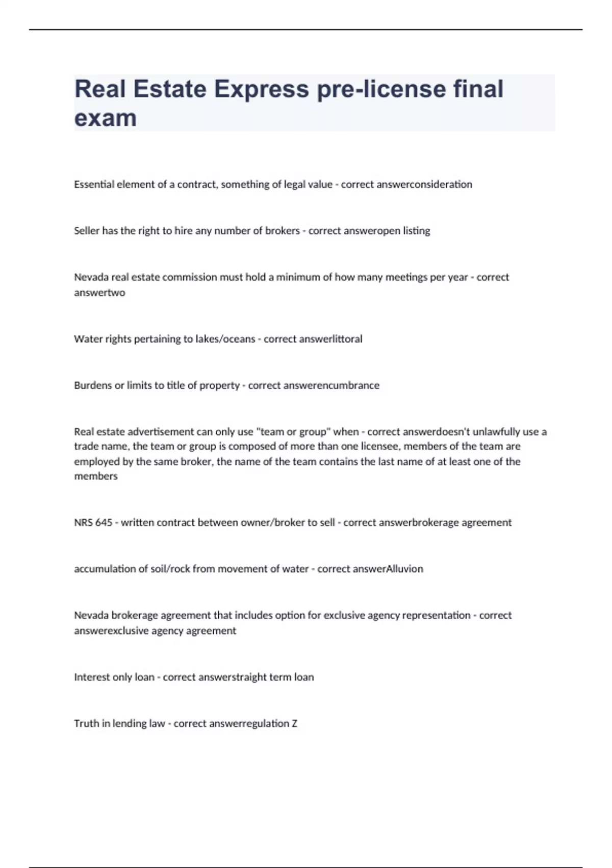 Essential element of a contract, something of legal value - correct answerconsideration Seller has the right to hire any number of brokers - correct answeropen listing Nevada real estate commission must hold a minimum of how many meetings per year - correct answertwo Water rights pertaining to lakes/oceans - correct answerlittoral Burdens or limits to title of property - correct answerencumbrance Real estate advertisement can only use "team or group" when - correct answerdoesn't unlawfully use a trade name, the team or group is composed of more than one licensee, members of the team are employed by the same broker, the name of the team contains the last name of at least one of the members NRS 645 - written contract between owner/broker to sell - correct answerbrokerage agreement accumulation of soil/rock from movement of water - correct answerAlluvion Nevada brokerage agreement that includes option for exclusive agency representation - correct answerexclusive agency agreement Interest only loan - correct answerstraight term loan Truth in lending law