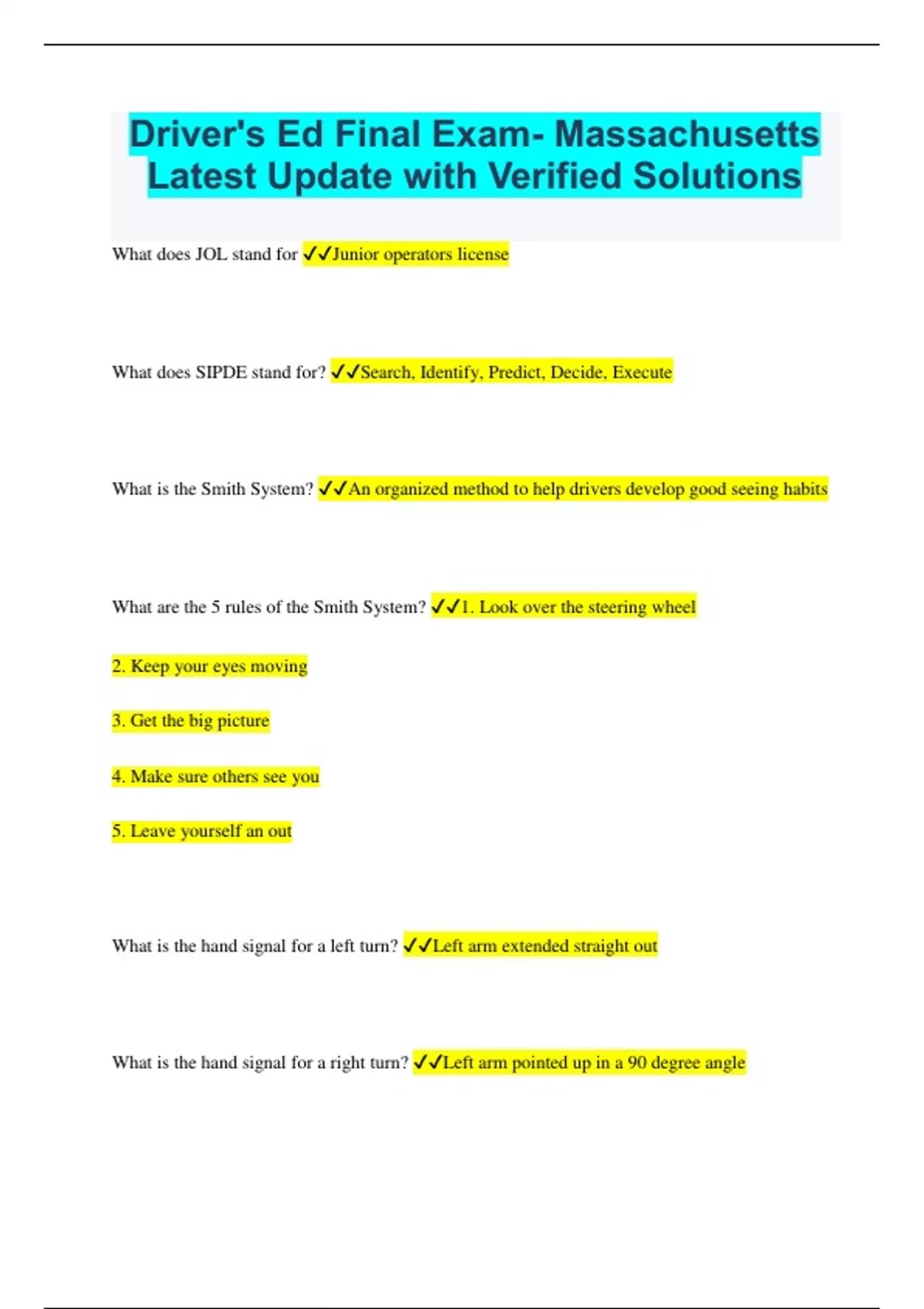 Driver's Ed Final Exam- Massachusetts Latest Update with Verified Solutions What does JOL stand for Junior operators license What does SIPDE stand for? Search, Identify, Predict, Decide, Execute What is the Smith System? An organized method to help drivers develop good seeing habits What are the 5 rules of the Smith System? 1. Look over the steering wheel 2. Keep your eyes moving 3. Get the big picture 4. Make sure others see you 5. Leave yourself an out What is the hand signal for a left turn? Left arm extended straight out What is the hand signal for a right turn? Left arm pointed up in a 90 degree angle What is the hand signal for stop or slow down? Left arm pointed down in a 90 degree angle What does HTS stand for and what is it made up of? Highway Transportation System. It's made up of people, vehicles, and roads. Who always has the right of way? Pedestria