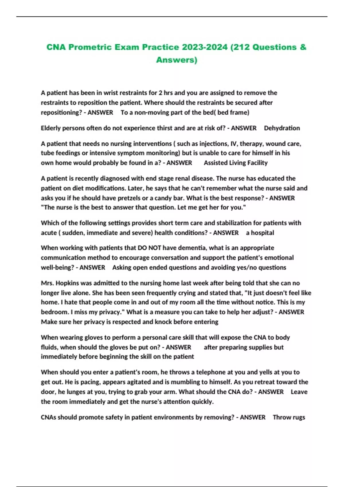 CNA Prometric Exam Practice (212 Questions & Answers) A patient has been in wrist restraints for 2 hrs and you are assigned to remove the restraints to reposition the patient. Where should the restraints be secured after repositioning? - ANSWER To a non-moving part of the bed( bed frame) Elderly persons often do not experience thirst and are at risk of? - ANSWER Dehydration A patient that needs no nursing interventions ( such as injections, IV, therapy, wound care, tube feedings or intensive symptom monitoring) but is unable to care for himself in his own home would probably be found in a? - ANSWER Assisted Living Facility A patient is recently diagnosed with end stage renal disease. The nurse has educated the patient on diet modifications. Later, he says that he can't remember what the nurse said and asks you if he should have pretzels or a candy bar. What is the best response? - ANSWER "The nurse is the best to answer that question. Let me get her for you." Which of the following settings provides short term care and stabilization for patients with acute ( sudden, immediate and severe) health conditions? - ANSWER a hospital When working with patients that DO NOT have dementia, what is an appropriate communication method to encourage conversation and support the patient's emotional well-being? - ANSWER Asking open ended questions and avoiding yes/no questions Mrs. Hopkins was admitted to the nursing home last week after being told that she can no longer live alone. She has been seen frequently crying and stated that, "It just doesn't feel like home. I hate that people come in and out of my room all the time without notice. This is my bedroom. I miss my privacy." What is a measure you can take to help her adjust? - ANSWER Make sure her privacy is respected and knock before entering When wearing gloves to perform a personal care skill that will expose the CNA to body fluids, when should the gloves be put on? - ANSWER after preparing supplies but immediately before beginning the skill on the patient When should you enter a patient's room, he throws a telephone at you and yells at you to get out. He is pacing, appears agitated and is mumbling to himself. As you retreat toward the door, he lunges at you, trying to grab your arm. What should the CNA do? - ANSWER Leave the room immediately and get the nurse's attention quickly. CNAs should promote safety in patient environments by removing? - ANSWER Throw rugs A nurse asks you to perform a task that you haven't been trained for that task, she gets mad and says, "it's not that hard, just figure it out!". What is an appropriate action? - ANSWER Refuse to perform the task for patient safety Performing foot care regularly gives the CNA an opportunity to: - ANSWER Notice any red areas, wounds, sores, rashes or other abnormalities To properly perform the Heimlich Maneuver, you would? - ANSWER Thrust firmly on the abdomen upward and inward from behind with a cupped fist Which of the following is a normal sign of aging? - ANSWER Muscles weaken and lose muscle tone A female patient with a history of seizures is admitted to your unit. What is an appropriate action to take to ensure the patient's safety? - ANSWER Report changes in sleep, personality and signs of stress in the patient to the nurse immediately A patient with a wound, sore or incision should be monitored for? - ANSWER Signs of infection (redness, warmth, drainage or odor) A CNA is caring for an elderly patient who seems more confused today. What is an appropriate action? - ANSWER Report the change to the nurse What is an important step to take before bathing a patient? - ANSWER Ask the patient to check the water temperature You are assigned to help a patient stand up at the side of the bed. The patient has been confined to bed for 3 days and is very weak. What is an important safety step to take before assisting the patient to stand? - ANSWER Have the patient dangle their legs while sitting on the edge of the bed for several minutes A small fire is noticed in the trash can of a room in a nursing home. After removing the patients from the room, the CNA would? - ANSWER Sound the alarm/alert others to the fire You are caring for a patient who had a stroke several months ago that resulted in right side weakness. You have been helping this person dress for several months, when today she appears irritated and states, "Just let me do it myself! Don't touch me!" What is an appropriate response? - ANSWER "I'm right here if you need me. Just tell me if you need help." Which of the following is a POSITIVE non-verbal communication - ANSWER Nodding to show agreement, interest and acknowledgment when another is talking You are sitting at the nurse's station, charting lunch intake, next to a nurse on the phone when a family member approaches. You continue to work and do not look up or make eye contact. After a few moments of silence, the family member says, "Excuse me " What is an appropriate action? - ANSWER Make eye contact, smile, apologize for the delay and ask how you can help Patients that are immobile or on bedrest are at risk of muscle tissue decreasing in size or strength due to lack of use. This is called? - ANSWER Atrophy Depression among the elderly: - ANSWER Is often overlooked or unrecognized A resident complains that something is wrong with his hearing aid and that it is not working as he hands it to you. What should you do? - ANSWER Inspect the hearing aid for cracks and make sure it is turned on According to Maslow's Hierarchy of needs, which needs are the most vital and must be met before any other needs can be achieved? - ANSWER Physical needs : Oxygen, water, food, elimination and rest Which of the following is NOT considered a sign of a potential infection in a patient? - ANSWER A temperature reading of 98.7 degrees Fahrenheit A patient you are caring for is getting stronger and feels able to transfer himself from bed to chair without your assistance. Which of the following statement 