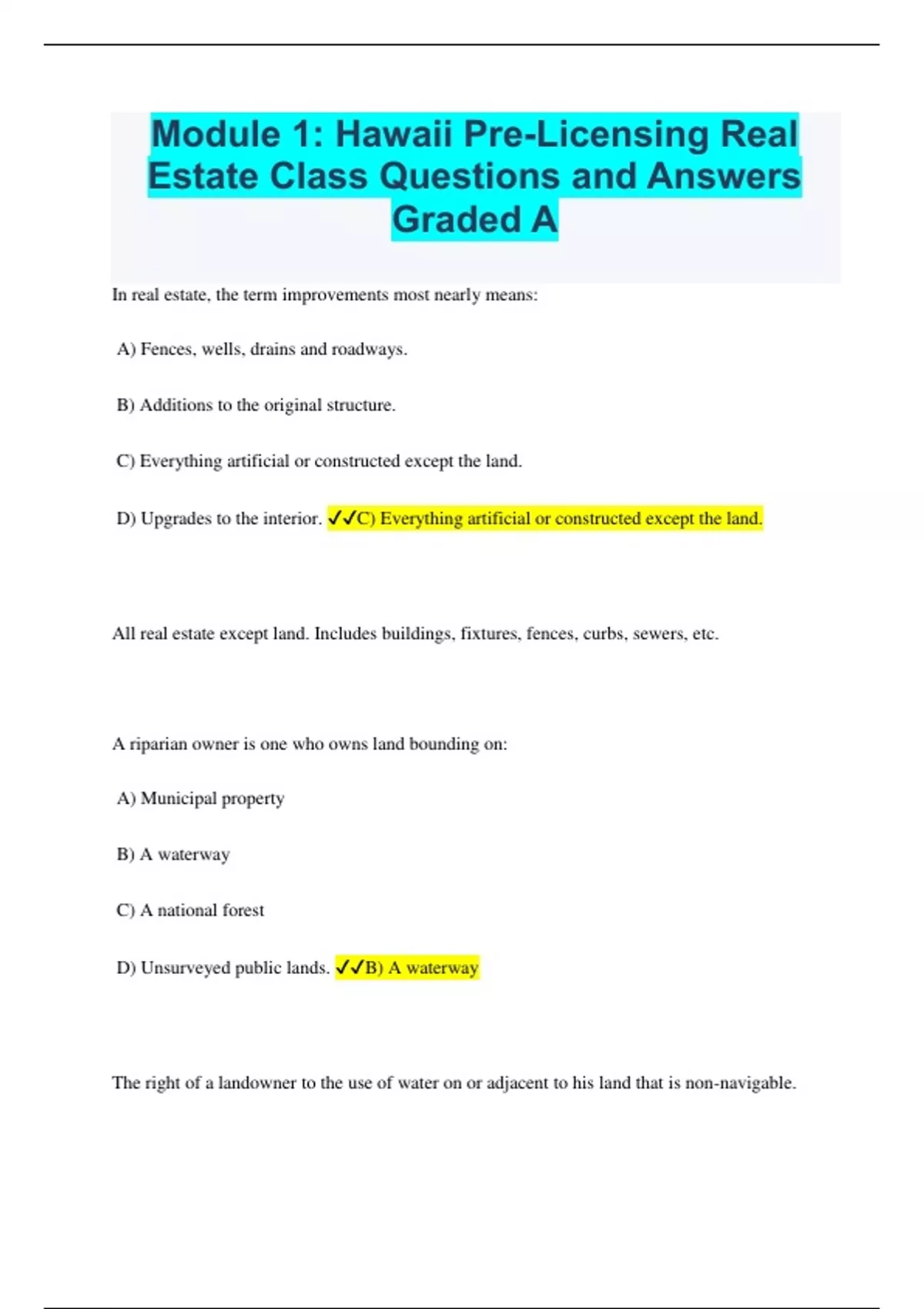 Module 1: Hawaii Pre-Licensing Real Estate Class Questions and Answers Graded A In real estate, the term improvements most nearly means: A) Fences, wells, drains and roadways. B) Additions to the original structure. C) Everything artificial or constructed except the land. D) Upgrades to the interior. C) Everything artificial or constructed except the land. All real estate except land. Includes buildings, fixtures, fences, curbs, sewers, etc. A riparian owner is one who owns land bounding on: A) Municipal property B) A waterway C) A national forest D) Unsurveyed public lands. B) A waterway The right of a landowner to the use of water on or adjacent to his land that is non-navigable. When land is necessary for the protection of water supplies, watershed, and water resources, the land use designation would likely be: A) Rural B) Urban C) Conservation D) Agricultural C) Conservatio