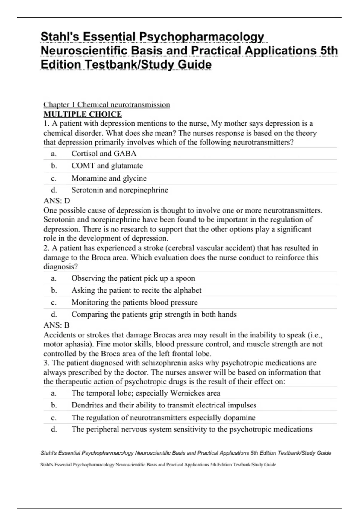 Stahl's Essential Psychopharmacology Neuroscientific Basis and Practical Applications 5th Edition Testbank/Study Guide
