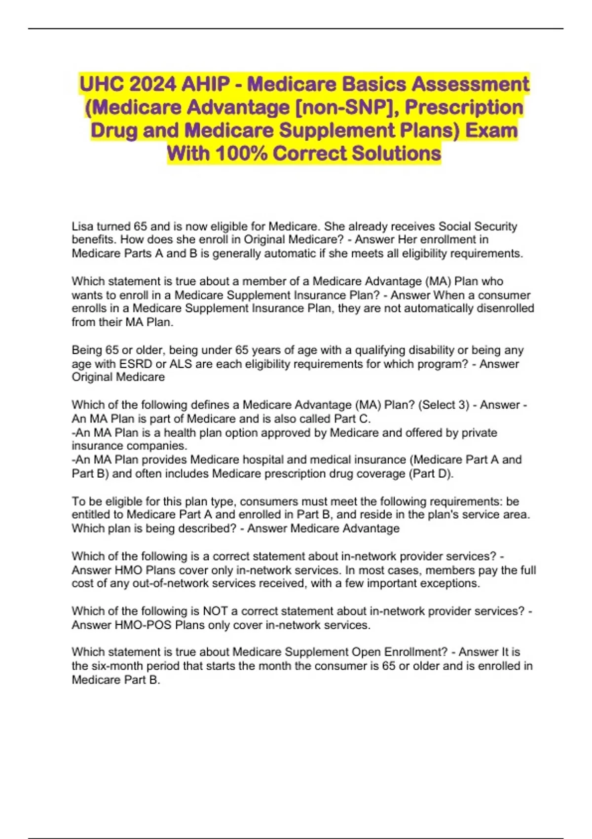 UHC 2024 AHIP - Medicare Basics Assessment (Medicare Advantage [non-SNP], Prescription Drug and Medicare Supplement Plans) Exam With 100% Correct Solutions...