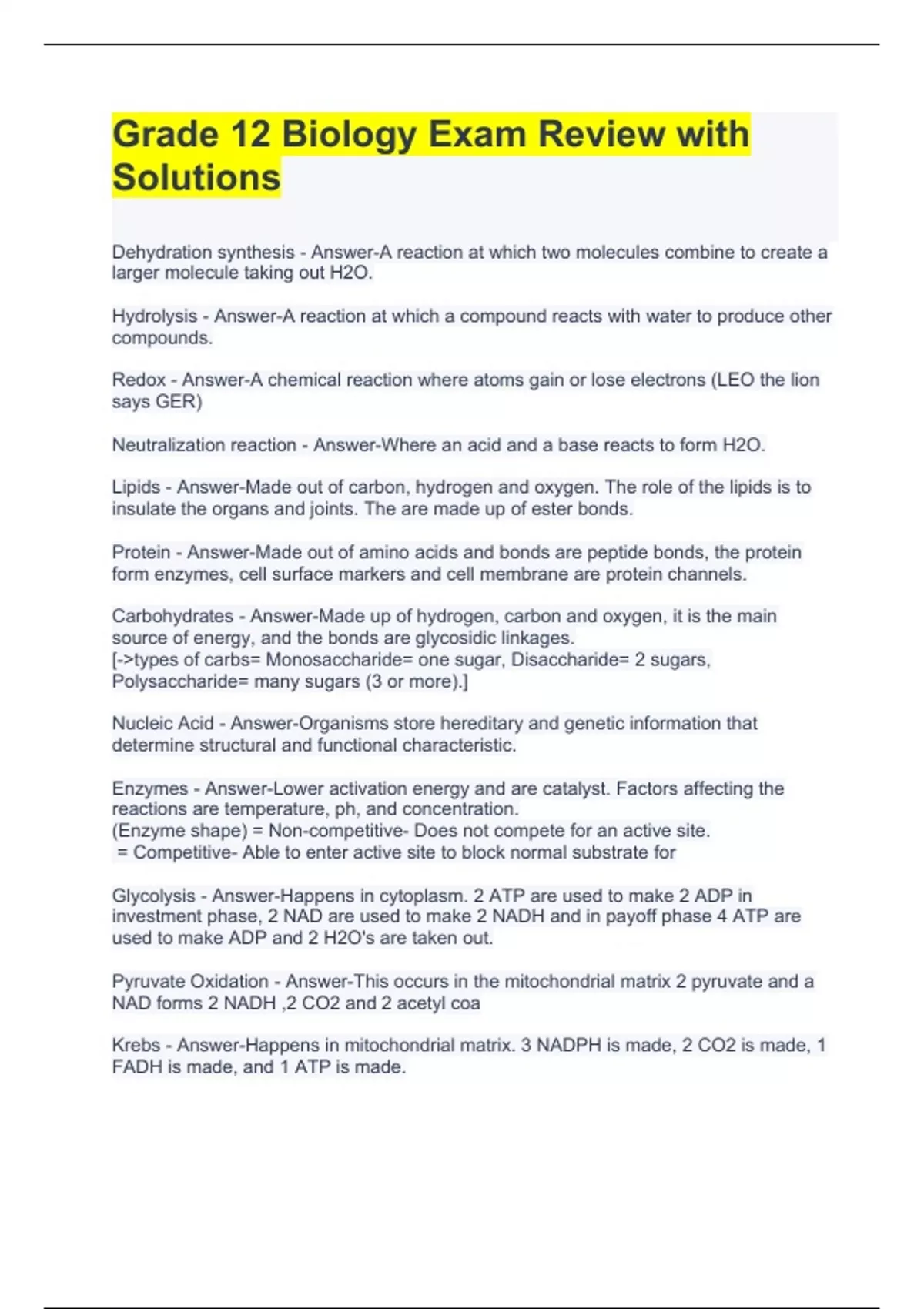 Dehydration synthesis - Answer-A reaction at which two molecules combine to create a larger molecule taking out H2O. Hydrolysis - Answer-A reaction at which a compound reacts with water to produce other compounds. Redox - Answer-A chemical reaction where atoms gain or lose electrons (LEO the lion says GER) Neutralization reaction - Answer-Where an acid and a base reacts to form H2O. Lipids - Answer-Made out of carbon, hydrogen and oxygen. The role of the lipids is to insulate the organs and joints. The are made up of ester bonds. Protein - Answer-Made out of amino acids and bonds are peptide bonds, the protein form enzymes, cell surface markers and cell membrane are protein channels. Carbohydrates - Answer-Made up of hydrogen, carbon and oxygen, it is the main source of energy, and the bonds are glycosidic linkages. [->types of carbs= Monosaccharide= one sugar, Disaccharide= 2 sugars, Polysaccharide= many sugars (3 or more).] Nucleic Acid - Answer-Organisms store hereditary and genetic information that determine structural and functional characteristic. Enzymes - Answer-Lower activation energy and are catalyst. Factors affecting the reactions are temperature, ph, and concentration. (Enzyme shape) = Non-competitive- Does not compete for an active site. = Competitive- Able to enter active site to block normal substrate for Glycolysis - Answer-Happens in cytoplasm. 2 ATP are used to make 2 ADP in investment phase, 2 NAD are used to make 2 NADH and in payoff phase 4 ATP are used to make ADP and 2 H2O's are taken out. Pyruvate Oxidation - Answer-This occurs in the mitochondrial matrix 2 pyruvate and a NAD forms 2 NADH ,2 CO2 and 2 acetyl coa Krebs - Answer-Happens in mitochondrial matrix. 3 NADPH is made, 2 CO2 is made, 1 FADH is made, and 1 ATP is made.