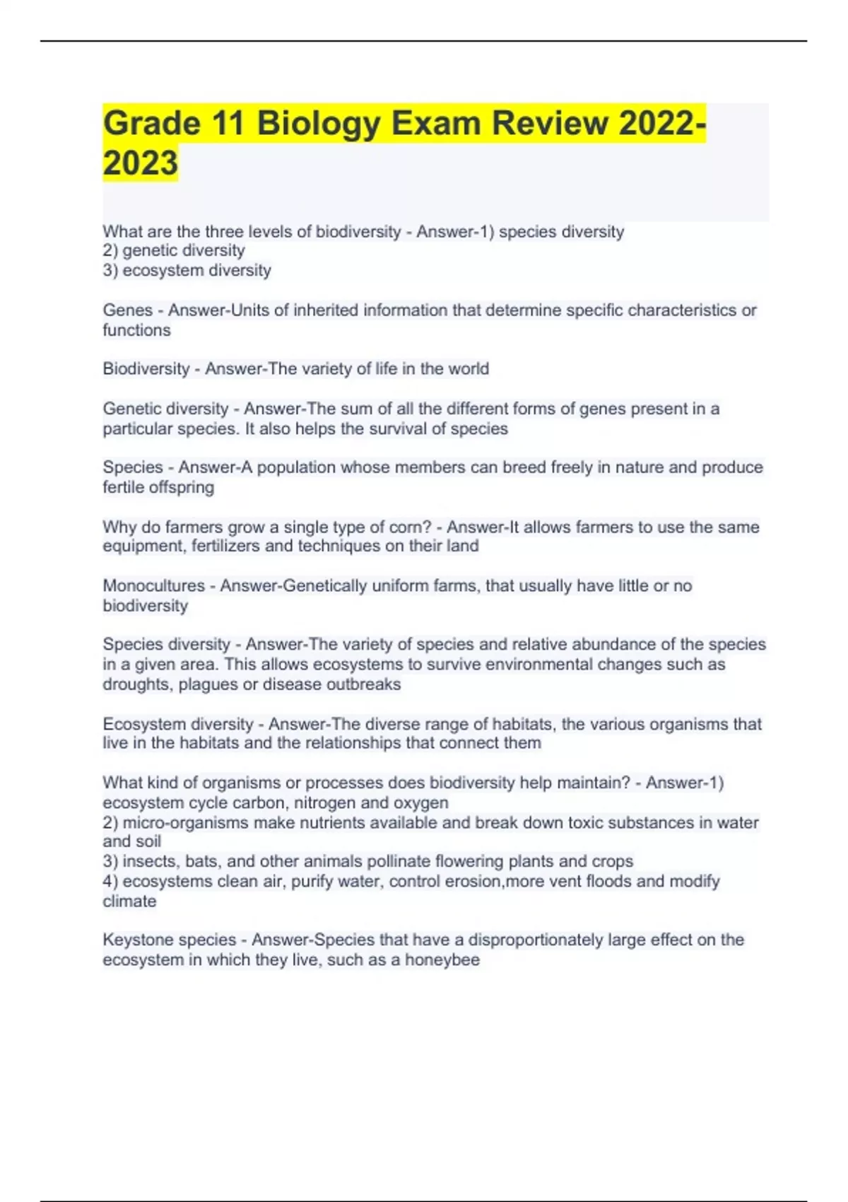 What are the three levels of biodiversity - Answer-1) species diversity 2) genetic diversity 3) ecosystem diversity Genes - Answer-Units of inherited information that determine specific characteristics or functions Biodiversity - Answer-The variety of life in the world Genetic diversity - Answer-The sum of all the different forms of genes present in a particular species. It also helps the survival of species Species - Answer-A population whose members can breed freely in nature and produce fertile offspring Why do farmers grow a single type of corn? - Answer-It allows farmers to use the same equipment, fertilizers and techniques on their land Monocultures - Answer-Genetically uniform farms, that usually have little or no biodiversity Species diversity - Answer-The variety of species and relative abundance of the species in a given area. This allows ecosystems to survive environmental changes such as droughts, plagues or disease outbreaks Ecosystem diversity - Answer-The diverse range of habitats, the various organisms that live in the habitats and the relationships that connect them What kind of organisms or processes does biodiversity help maintain? - Answer-1) ecosystem cycle carbon, nitrogen and oxygen 2) micro-organisms make nutrients available and break down toxic substances in water and soil 3) insects, bats, and other animals pollinate flowering plants and crops 4) ecosystems clean air, purify water, control erosion,more vent floods and modify climate Keystone species - Answer-Species that have a disproportionately large effect on the ecosystem in which they live, such as a honeybee