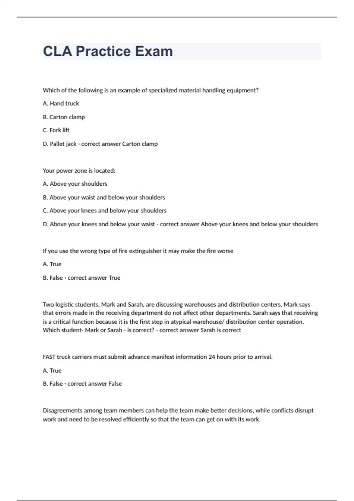 Which of the following is an example of specialized material handling equipment? A. Hand truck B. Carton clamp C. Fork lift D. Pallet jack - correct answer Carton clamp Your power zone is located: A. Above your shoulders B. Above your waist and below your shoulders C. Above your knees and below your shoulders D. Above your knees and below your waist - correct answer Above your knees and below your shoulders If you use the wrong type of fire extinguisher it may make the fire worse A. True B. False - correct answer True Two logistic students, Mark and Sarah, are discussing warehouses and distribution centers. Mark says that errors made in the receiving department do not affect other departments. Sarah says that receiving is a critical function because it is the first step in atypical warehouse/ distribution center operation. Which student- Mark or Sarah - is correct? - correct answer Sarah is correct FAST truck carriers must submit advance manifest information 24 hours prior to arrival. A. True B. False - correct answer False Disagreements among team members can help the team make better decisions, while conflicts disrupt work and need to be resolved efficiently so that the team can get on with its work.