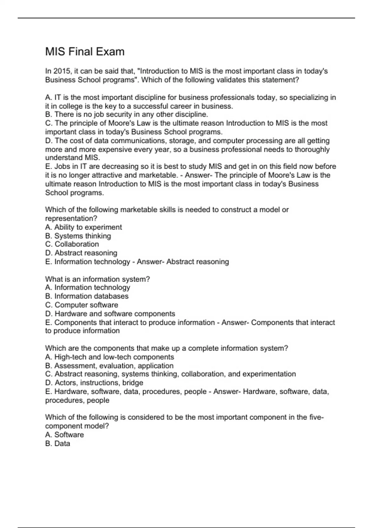E. Hardware, software, data, procedures, people - Answer- Hardware, software, data,