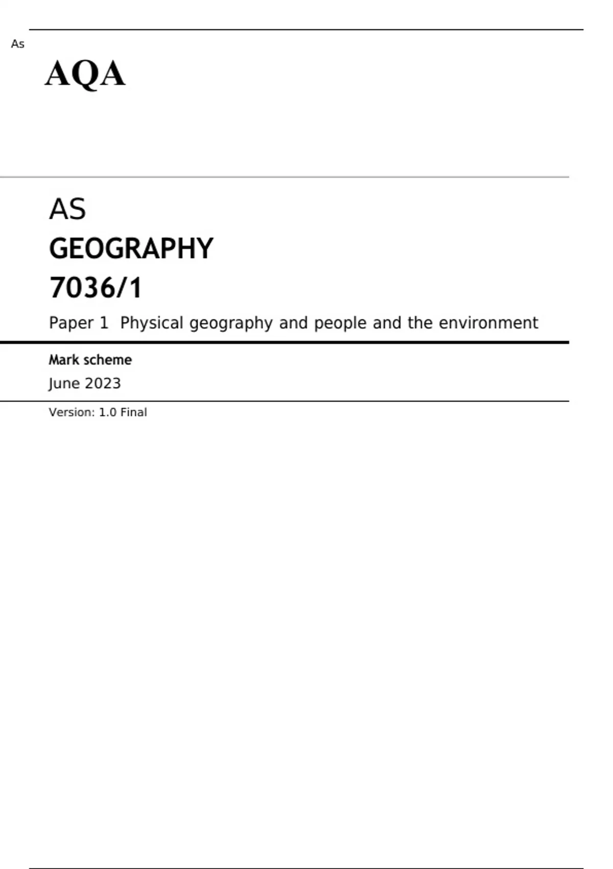 AQA AS GEOGRAPHY Paper 1 JUNE 2023 MARK SCHEME: Physical geography and people and the environment