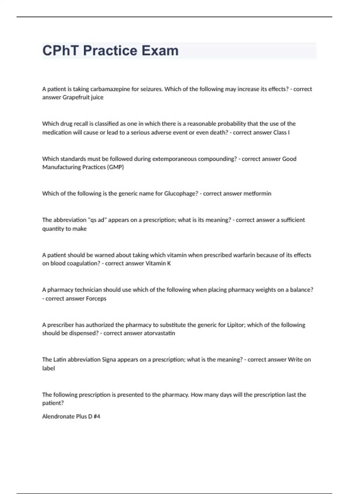 CPhT Practice Exam(question n answers )graded A+ 2023