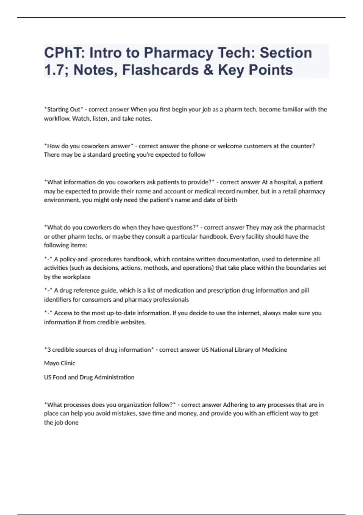 CPhT Intro to Pharmacy Tech Section 1.7 Notes, Flashcards & Key Points 2023 passed