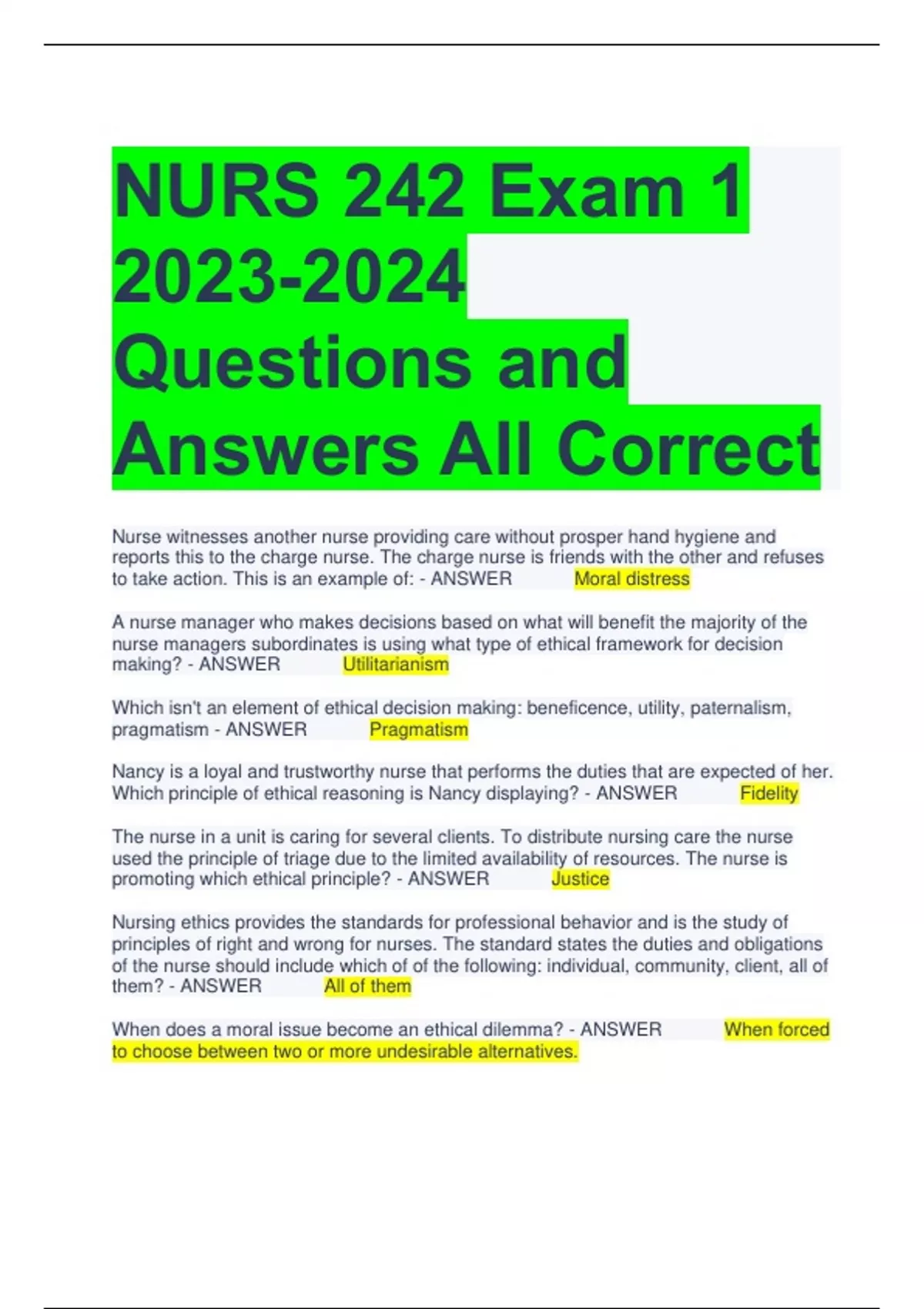 NURS 242 Exam Questions and Answers All Correct Nurse witnesses another nurse providing care without prosper hand hygiene and reports this to the charge nurse. The charge nurse is friends with the other and refuses to take action. This is an example of: - ANSWER Moral distress A nurse manager who makes decisions based on what will benefit the majority of the nurse managers subordinates is using what type of ethical framework for decision making? - ANSWER Utilitarianism Which isn't an element of ethical decision making: beneficence, utility, paternalism, pragmatism - ANSWER Pragmatism Nancy is a loyal and trustworthy nurse that performs the duties that are expected of her. Which principle of ethical reasoning is Nancy displaying? - ANSWER Fidelity The nurse in a unit is caring for several clients. To distribute nursing care the nurse used the principle of triage due to the limited availability of resources. The nurse is promoting which ethical principle? - ANSWER Justice Nursing ethics provides the standards for professional behavior and is the study of principles of right and wrong for nurses. The standard states the duties and obligations of the nurse should include which of of the following: individual, community, client, all of them? - ANSWER All of them When does a moral issue become an ethical dilemma? - ANSWER When forced to choose between two or more undesirable alternatives. The nurse manager didn't hire sally for the assistant manager job. The nurse manager informed sally that she was a great fit but an internal candidate was selected instead. The real reason sally wasn't hired was because her drug test was positive. Which of the principles of ethical reasoning didn't the nurse follow? - ANSWER Veracity A client is advised by the doctor to undergo chemo. An informed consent is not yet signed. The client requests info related to chemo and the drugs that will be given to him. The nurse explains the side effects and meds. The nurse answered all questions even though the client chose not to undergo chemo. The nurse uses which principle of ethical reasoning? - ANSWER Veracity Nurse Bobby avoids deliberate harm and risk of harm during his performance of nursing actions. The nurse is promoting which ethical principle? - ANSWER Nonmaleficence What does provision one state? - ANSWER Nurse practices with compassion and respect for inherent dignity, worth and unique attributes of every person Patient has right to decide for themselves- autonomy to accept or refuse or terminate care (ie no more feeding tube) What does provision 2 state? - ANSWER Nurse's primary commitment is to the patient, whether an individual, family, group, community or population