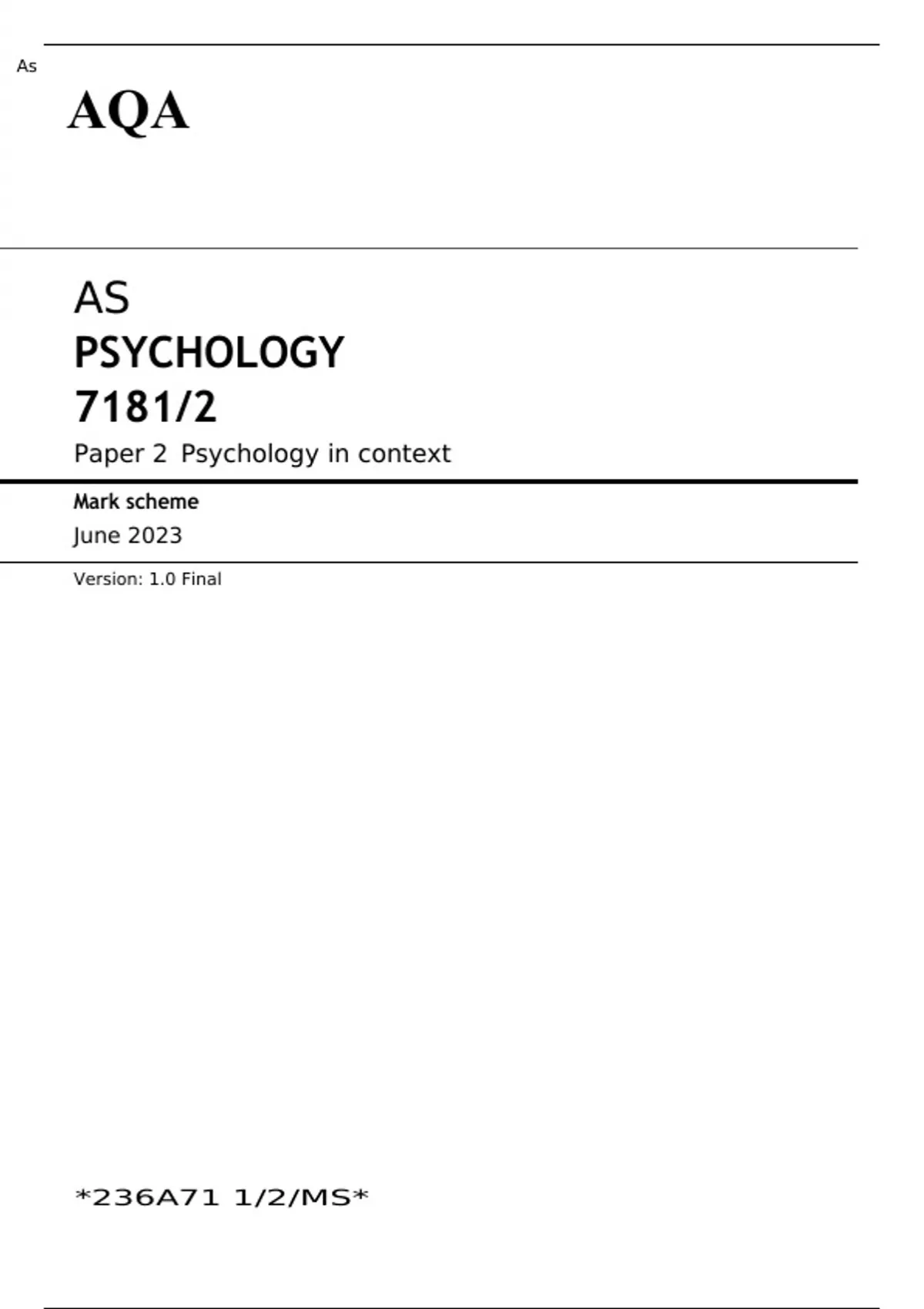 AQA AS PSYCHOLOGY Paper 2 JUNE 2023 MARK SCHEME: Psychology in context