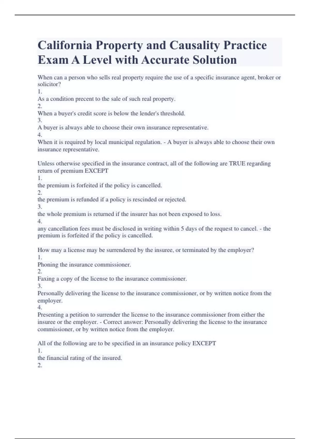 California Property and Causality Practice Exam A Level with Accurate Solution When can a person who sells real property require the use of a specific insurance agent, broker or solicitor? 1. As a condition precent to the sale of such real property. 2. When a buyer's credit score is below the lender's threshold. 3. A buyer is always able to choose their own insurance representative. 4. When it is required by local municipal regulation. - A buyer is always able to choose their own insurance representative. Unless otherwise specified in the insurance contract, all of the following are TRUE regarding return of premium EXCEPT 1. the premium is forfeited if the policy is cancelled. 2. the premium is refunded if a policy is rescinded or rejected. 3. the whole premium is returned if the insurer has not been exposed to loss. 4. any cancellation fees must be disclosed in writing within 5 days of the request to cancel. - the premium is forfeited if the policy is cancelled. How may a license may be surrendered by the insuree, or terminated by the employer? 1. Phoning the insurance commissioner. 2. Faxing a copy of the license to the insurance commissioner. 3. Personally delivering the license to the insurance commissioner, or by written notice from the employer. 4. Presenting a petition to surrender the license to the insurance commissioner from either the insuree or the employer. - Correct answer: Personally delivering the license to the insurance commissioner, or by written notice from the employer. All of the following are to be specified in an insurance policy EXCEPT 1. the financial rating of the insured. 2. a statement of the expected premium. 3. the parties between whom the contract is made. 4. the period during which the insurance is to continue. - the financial rating of the insured. In the event of receiving notice of a claim or other claim communication, all of the following timelines are accurate EXCEPT 1. every licensee or claims agent shall transmit notice of the claim to the insurer in no more than 5 calendar days. 2. every licensee shall immediately, but in no more than 15 calendar days, furnish them a complete response. 3. every license or claims agent shall immediately transmit notice of claim to insurer. 4. every insurer shall within15 calendar days acknowledge receipt and provide to the claimant the necessary forms. - every licensee or claims agent shall transmit notice of the claim to the insurer in no more than 5 calendar days. What is the primary function of The California Automotive Assigned Risk Plan (CAARP)? 1. to serve as an insurer to provide automobile coverage for low income people 2. to monitor the rates of automobile insurers to make sure the prices remain competitive 3. to put people who have trouble obtaining insurance in touch with insurers who may be required by law to insure them 4. to provide training for agents, and to determine which agents and automobile insurers are able to place business through the program - to put people who have trouble obtaining insurance in touch with insurers who may be required by law to insure them Which of the following may be insured against? 1. Disability. 2. Accidental death. 3. Wagering losses. 4. Catastrophic losses. - Correct answer: Wagering losses. Which of the following is a VALID reason to deny coverage or charge a higher rate or premium? 1. ancestry. 2. race, color or religion. 3. driving history or motor vehicle record. 4. sexual orientation or gender expression. - driving history or motor vehicle record. All of the following are authorized activities for the Limited Lines Automobile Insurance Agent EXCEPT if the agent 1. provides all necessary disclosures. 2. charges and collects a broker's fee for service. 3. transacts insurance on behalf of the consumer. 4. sells automobile property and liability policies. - charges and collects a broker's fee for service. Where shall an express warranty be made? 1. in the policy itself 2. on a specimen copy in the contract 3. on an illustration provided to the policy owner 4. in a brochure of the policy that is described in detail - in the policy itself All of the following are requirements to offer earthquake insurance with residential property coverage EXCEPT 1. earthquake insurance is required to be offered with any new policy or renewal. 2. earthquake insurance may be provided through an affiliate or nonaffiliate insurer. 3. a separate policy to cover the earthquake is required, an endorsement is insufficient. 4. earthquake peril can either be offered alone, or offered in combination with other perils. - a separate policy to cover the earthquake is required, an endorsement is insufficient. Which circumstances in a pretext interview determine if the questions are permissible? 1. When an insured is questioned prior to the application to determine the best recommendations for coverage. 2. When an insured is consulted by a person who hides his true identity on purpose when fraud for a claim is suspected. 3. When questions are asked to help underwriting decide on coverage for the insured when health problems are suspected. 4. When questions are posed by a person who refuses to identify himself or his relation to the company prior to a policy being underwritten. - Correct answer: When an insured is consulted by a person who hides his true identity on purpose when fraud for a claim is suspected. An insurance agent is a person who transacts all of the following types of insurance EXCEPT 1. annuities. 2. homeowners. 3. auto insurance. 4. life insurance. - life insurance. Who is able to place business through the California Automobile Assessed Risk Program? 1. any agent licensed in property and casualty insurance 2. only insurers with operating headquarters based in California 3. only agent/brokers licensed in fire and casualty who have also been certified through CAARP. 4. any agent who has been licensed in the State of California for a minimum of 5 years and is certified by CAARP. - on