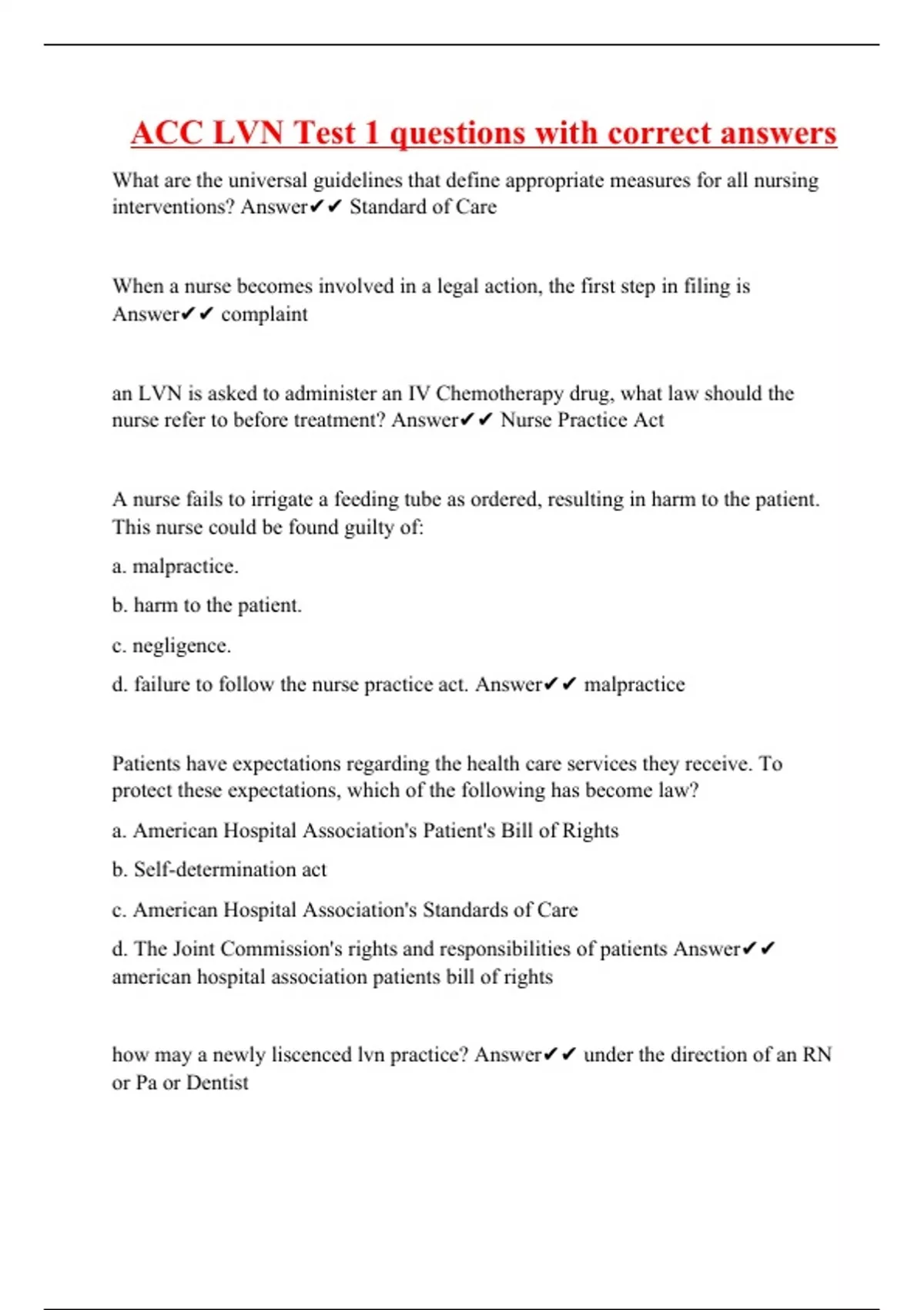 What are the universal guidelines that define appropriate measures for all nursing interventions? Answer Standard of Care When a nurse becomes involved in a legal action, the first step in filing is Answer complaint an LVN is asked to administer an IV Chemotherapy drug, what law should the nurse refer to before treatment? Answer Nurse Practice Act A nurse fails to irrigate a feeding tube as ordered, resulting in harm to the patient. This nurse could be found guilty of: a. malpractice. b. harm to the patient. c. negligence. d. failure to follow the nurse practice act. Answer malpractice Patients have expectations regarding the health care services they receive. To protect these expectations, which of the following has become law? a. American Hospital Association's P