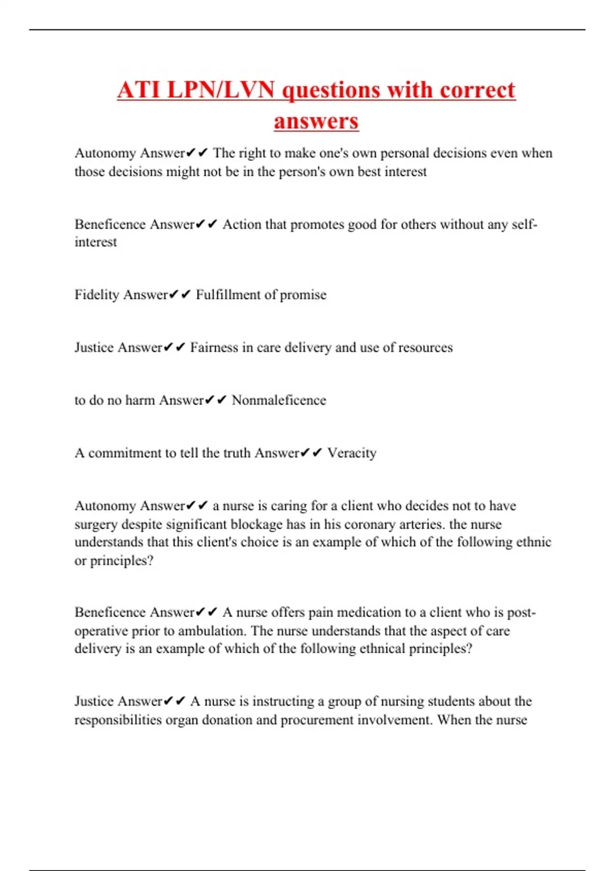Autonomy Answer The right to make one's own personal decisions even when those decisions might not be in the person's own best interest Beneficence Answer Action that promotes good for others without any self-interest Fidelity Answer Fulfillment of promise Justice Answer Fairness in care delivery and use of resources to do no harm Answer Nonmaleficence A commitment to tell the truth Answer Veracity Autonomy Answer a nurse is caring for a client who decides not to have surgery despite significant blockage has in his coronary arteries. the nurse understands that this client's choice is an example of which of the following ethnic or principles? Beneficence Answer A nurse offers pain medication to a client who is post-operative prior to ambulation. The nurse understands that the aspect of care delivery is an example of which of the following ethnical principles? Justice Answer A nurse is instru