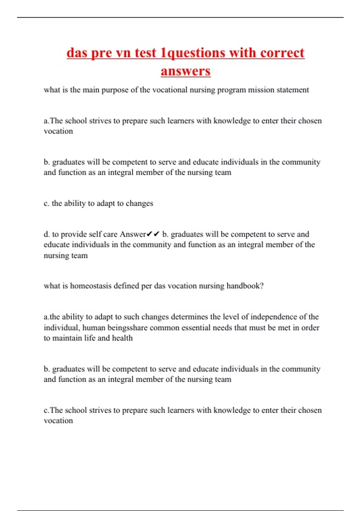 what is the main purpose of the vocational nursing program mission statement a.The school strives to prepare such learners with knowledge to enter their chosen vocation b. graduates will be competent to serve and educate individuals in the community and function as an integral member of the nursing team c. the ability to adapt to changes d. to provide self care Answer b. graduates will be competent to serve and educate individuals in the community and function as an integral member of the nursing team what is homeostasis defined per das vocation nursing handbook? ability to adapt to such changes determines the level of independence of the individual, human beingsshare common essential needs that must be met in order to maintain life and health b. graduates will be competent to serve and educate individuals in the community and function as an integral member of the nursing team c.The school strives to prepare such learners with knowledge to enter their chosen vocation