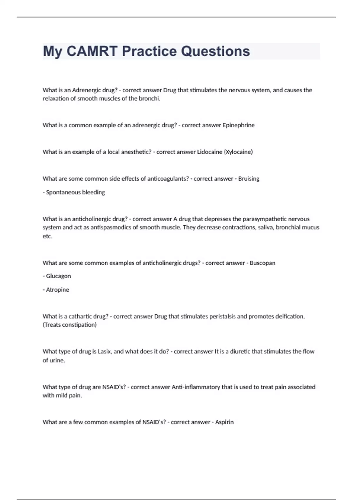 What is an Adrenergic drug? - correct answer Drug that stimulates the nervous system, and causes the relaxation of smooth muscles of the bronchi. What is a common example of an adrenergic drug? - correct answer Epinephrine What is an example of a local anesthetic? - correct answer Lidocaine (Xylocaine) What are some common side effects of anticoagulants? - correct answer - Bruising - Spontaneous bleeding What is an anticholinergic drug? - correct answer A drug that depresses the parasympathetic nervous system and act as antispasmodics of smooth muscle. They decrease contractions, saliva, bronchial mucus etc. What are some common examples of anticholinergic drugs? - correct answer - Buscopan - Glucagon - Atropine What is a cathartic drug? - correct answer Drug that stimulates peristalsis and promotes deification. (Treats constipation) What type of drug is Lasix, and what does it do? - correct answer It is a diuretic that stimulates the flow of urine. What type of drug are NSAID's? - correct answer Anti-inflammatory that is used to treat pain associated with mild pain. What are a few common examples of NSAID's? - correct answer - Aspirin - Advil - Celebrex - Aleve What is the annual dose limit for the whole body of radiation workers? - correct answer 20 mSv What is the annual dose limit for the lens of the eye for radiation workers? - correct answer 150 mSv What is the annual dose limit for skin, hands, and all other organs for radiation workers? - correct answer 500 mSv What is the dose that can result in permanent sterility in men? - correct answer 5 Gy