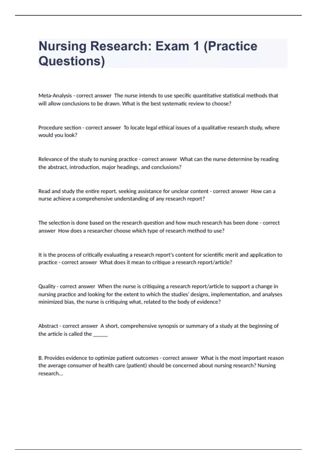 Meta-Analysis - correct answer The nurse intends to use specific quantitative statistical methods that will allow conclusions to be drawn. What is the best systematic review to choose? Procedure section - correct answer To locate legal ethical issues of a qualitative research study, where would you look? Relevance of the study to nursing practice - correct answer What can the nurse determine by reading the abstract, introduction, major headings, and conclusions? Read and study the entire report, seeking assistance for unclear content - correct answer How can a nurse achieve a comprehensive understanding of any research report? The selection is done based on the research question and how much research has been done - correct answer How does a researcher choose which type of research method to use? It is the process of critically evaluating a research report's content for scientific merit and application to practice - correct answer What does it mean to critique a research report/article? Quality - correct answer When the nurse is critiquing a research report/article to support a change in nursing practice and looking for the extent to which the studies' designs, implementation, and analyses minimized bias, the nurse is critiquing what, related to the body of evidence? Abstract - correct answer A short, comprehensive synopsis or summary of a study at the beginning of the article is called the _____ B. Provides evidence to optimize patient outcomes - correct answer What is the most important reason the average consumer of health care (patient) should be concerned about nursing research? Nursing research... A. Supports that the government is putting all tax dollars to good use B. Provides evidence to optimize patient outcomes C. Supports hospitals that desire to become accredited D. Justifies the cost of services when patients are paying their medical bills A. Research provides the nurse with evidence-based knowledge needed to make sound clinical decisions - correct answer Why should the registered nurse at the bedside be concerned about research for the delivery of quality nursing care? A. Research provides the nurse with evidence-based knowledge needed to make sound clinical decisions B. It only takes once small study to change nursing practice dramatically C. Traditional nursing care is no longer appropriate for twenty-first century nursing D. It allows the nurse to stay in his/her comfort zone, using the same information that seems to have provided good care B. At the end of the literature review section - correct answer A nurse researcher is searching for the purpose of a study in a research report. Where is the most likely place to find the purpose in the report? A. At the end of the research design section B. At the end of the literature review section