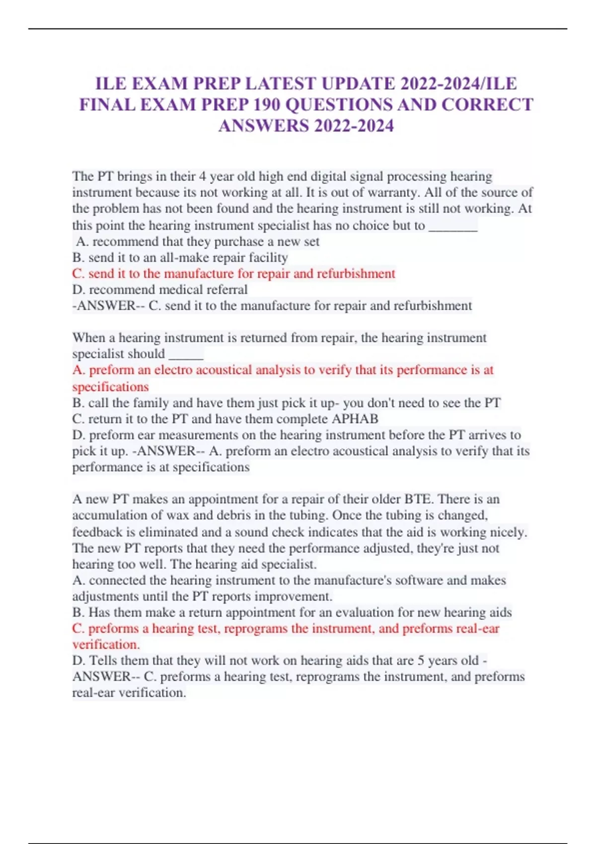 ILE EXAM PREP LATEST UPDATE /ILE FINAL EXAM PREP 190 QUESTIONS AND CORRECT ANSWERS The PT brings in their 4 year old high end digital signal processing hearing instrument because its not working at all. It is out of warranty. All of the source of the problem has not been found and the hearing instrument is still not working. At this point the hearing instrument specialist has no choice but to _______ A. recommend that they purchase a new set B. send it to an all-make repair facility C. send it to the manufacture for repair and refurbishment D. recommend medical referral -ANSWER-- C. send it to the manufacture for repair and refurbishment When a hearing instrument is returned from repair, the hearing instrument specialist should _____ A. preform an electro acoustical analysis to verify that its performance is at specifications B. call the family and have them just pick it up- you don't need to see the PT C. return it to the PT and have them complete APHAB D. preform ear measurements on the hearing instrument before the PT arrives to pick it up. -ANSWER-- A. preform an electro acoustical analysis to verify that its performance is at specifications A new PT makes an appointment for a repair of their older BTE. There is an accumulation of wax and debris in the tubing. Once the tubing is changed, feedback is eliminated and a sound check indicates that the aid is working nicely. The new PT reports that they need the performance adjusted, they're just not hearing too well. The hearing aid specialist. A. connected the hearing instrument to the manufacture's software and makes adjustments until the PT reports improvement. B. Has them make a return appointment for an evaluation for new hearing aids C. preforms a hearing test, reprograms the instrument, and preforms real-ear verification. D. Tells them that they will not work on hearing aids that are 5 years old - ANSWER-- C. preforms a hearing test, reprograms the instrument, and preforms real-ear verification. common complaints about the quality of the PT own voice are that its echo-y or tinny. These can often be addressed by ____ and ___, respectively A. increasing the low frequency gain, increasing the high frequency gain B. decreasing the low frequency gain, increasing the high frequency gain C. increasing the low frequency gain, decreasing the high frequency gain D. decreasing the low frequency gain, decreasing the high frequency gain. - ANSWER-- D. decreasing the low frequency gain, decreasing the high frequency gain. Feedback can be from ____ A. a bad battery B. a plugged earmold C. an internal source ( internal feedback) or an external source ( external feedback) D. and internal source ( split earmold tubing) or an external source ( internal feedback) -ANSWER-- C. an internal source ( internal feedback) or an external source ( external feedback) If the reciever and or the mircophone is completely plugged with wax or debris, the hearing aid specalist should _____ A. send it back for repair B. clear out these components and check if the hearing instrument is working C. replace both components in the office D. recommend a medical referral -ANSWER-- B. clear out these components and check if the hearing instrument is working ALDs can be categorized according to ____ A. those that connect to the hearing instruments and those that connent to cochlear implants B. the type of alerting device that they activate C. whether they are powered by bluetooth or a 2.4 GHz source D. those that help connect the person with hearing loss to other people and those that accommodate an activity of daily living -ANSWER-- D. those that help connect the person with hearing loss to other people and those that accommodate an activity of daily living A gateway device has a unique manufacture specific name but they all ___ A. connect hearing instruments to a bluetooth enabled devices and convert the hearing instruments into a wireless headset for binaural hearing