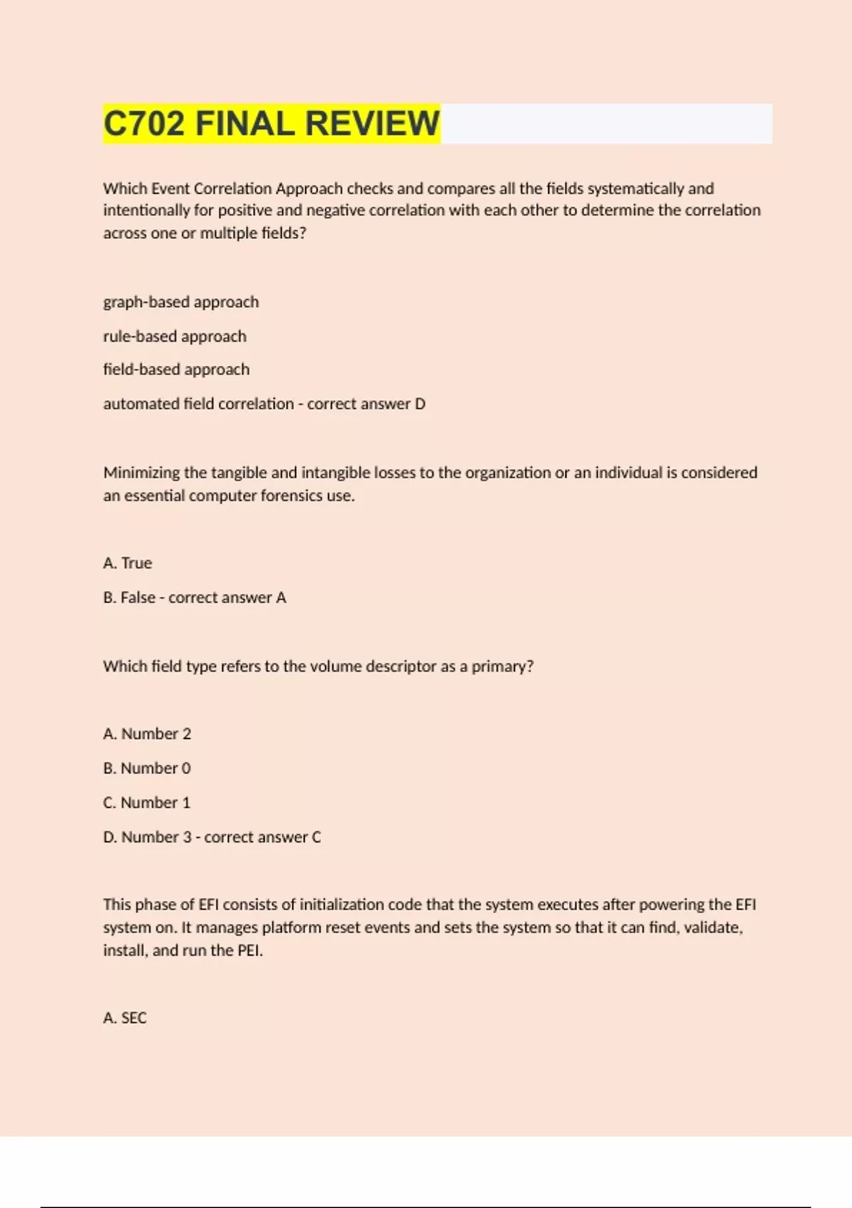 Which Event Correlation Approach checks and compares all the fields systematically and intentionally for positive and negative correlation with each other to determine the correlation across one or multiple fields? graph-based approach rule-based approach field-based approach automated field correlation D Minimizing the tangible and intangible losses to the organization or an individual is considered an essential computer forensics use. A. True B. False A Which field type refers to the volume descriptor as a primary? A. Number 2 B. Number 0 C. Number 1 D. Number 3 C This phase of EFI consists of initialization code that the system executes after powering the EFI system on. It manages platform reset events and sets the system so that it can find, validate, install, and run the PEI. A. SEC B. PEI C. DXE D. BDS E. RT A Most of the initialization happens in this phase. Using the Hand-Off Block List (HOBL), it initializes the entire system physical memory, I/O, and MIMO (Memory Mapped Input Output) resources and finally begins dispatching DXE Drivers present in the system Firmware Volumes (given in the HOBL). The DXE core produces a set of EFI Boot Services and EFI Runtime Services. The EFI Boot Services provided are allocating memory and loading executable images. The EFI Runtime services provided are converting memory addresses from physical to virtual while handing over to the kernel, and resetting the CPU, to code running within the EFI environment or within the OS kernel once the CPU takes the control of the system. A. SEC B. PEI C. DXE D. BDS E. RT C This phase initializes the CPU, temporary memory, and boot firmware volume (BFV). It locates and executes the Pre Initialization chapters (PEIMs) present in the BFV so as to initialize all the found hardware in the system. Finally, it creates a Hand-Off Block List with all found resources interface descriptors and passes it to the next phase i.e. the DXE phase. A. SEC B. PEI C. DXE D. BDS E. RT B In this phase, the BDS interprets the boot configuration data and selects the Boot Policy for later implementation. This phase works with the DXE to check if the device drivers require signature verification.In this phase, the system loads MBR boot code into memory for Legacy BIOS Boot or loads the Bootloader program from the EFI partition for UEFI Boot. It also provides an option for the user to choose EFI Shell or an UEFI application as the Boot Device from the Setup. A. SEC B. PEI C. DXE D. BDS E. RT D At this point, the system clears the UEFI program from memory and transfers it to the OS. During UEFI BIOS update the OS calls the run time service using a small part of the memory. A. SEC B. PEI C. DXE D. BDS E. RT E Which of the following basic partitioning tools displays details about GPT partition tables in Windows OS? A. DiskPart B. Gparted C. Disk Utility D. Fdisk A How large is the partition table structure that stores information about the partitions present on the hard disk? A. 32-byte B. 64-bit C. 64-byte D. 32-bit C How many bits are used by the MBR partition scheme for storing LBAs (Logical Block Addresses) and the size information on a 512-byte sector? A. 128 B. 64 C. 256 D. 32 D Which of the following basic partitioning tools displays details about GPT partition tables in Windows OS? A. DiskPart B. Gparted C. Disk Utility D. Fdisk A What component of a typical FAT32 file system consists of data that the document framework uses to get to the volume and utilizes the framework parcel to stack the working portion documents? A. Boot Sector B. FAT Area C. Data Area D. Reserved Area A Which file system used in Linux was developed by Stephen Tweedie in 2001 as a journaling file system that improves reliability of the system? A. Ext2 B. Ext C. Ext4 D. Ext3 D How many bit values does HFS use to address allocation blocks? A. 8 B. 16 C. 64 D. 32 B Striped set (min 2 disks) w/o parity and no fault tolerance. Any disk failure destroys the array. A. Raid 0 B. Raid 1 C. Raid 10 D. Raid 2 E. Raid 3 F. Raid 4 G. Raid 5 H. Raid 6 A
