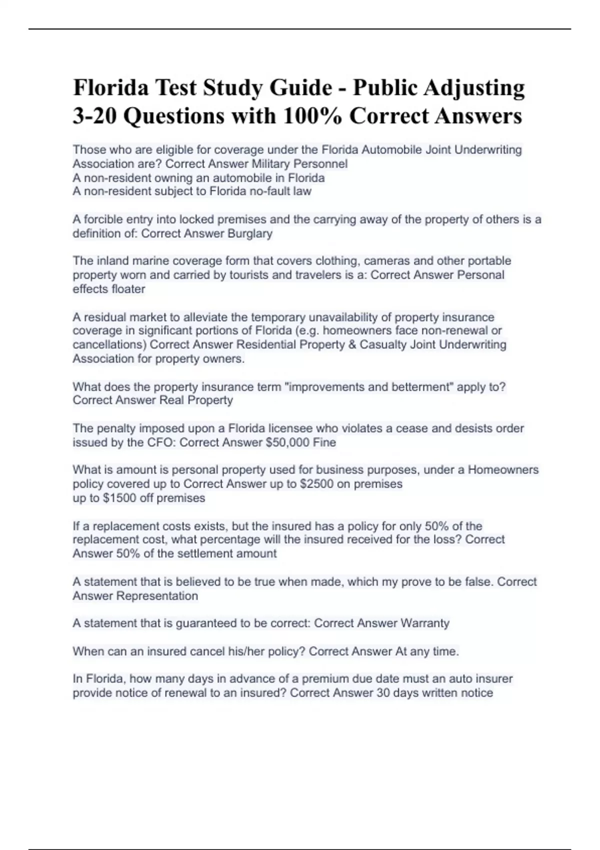 Florida Test Study Guide - Public Adjusting 3-20 Questions with 100% Correct Answers