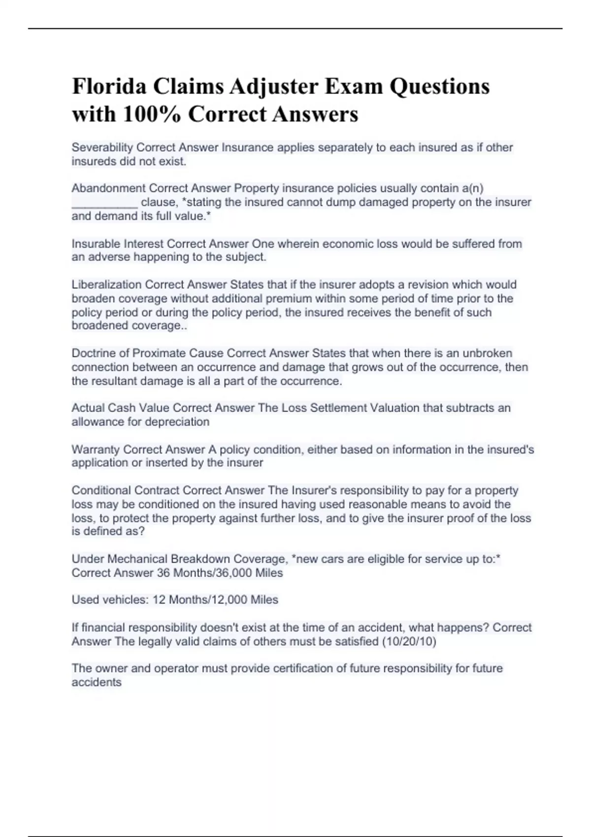 Florida Claims Adjuster Exam Questions with 100% Correct Answers
