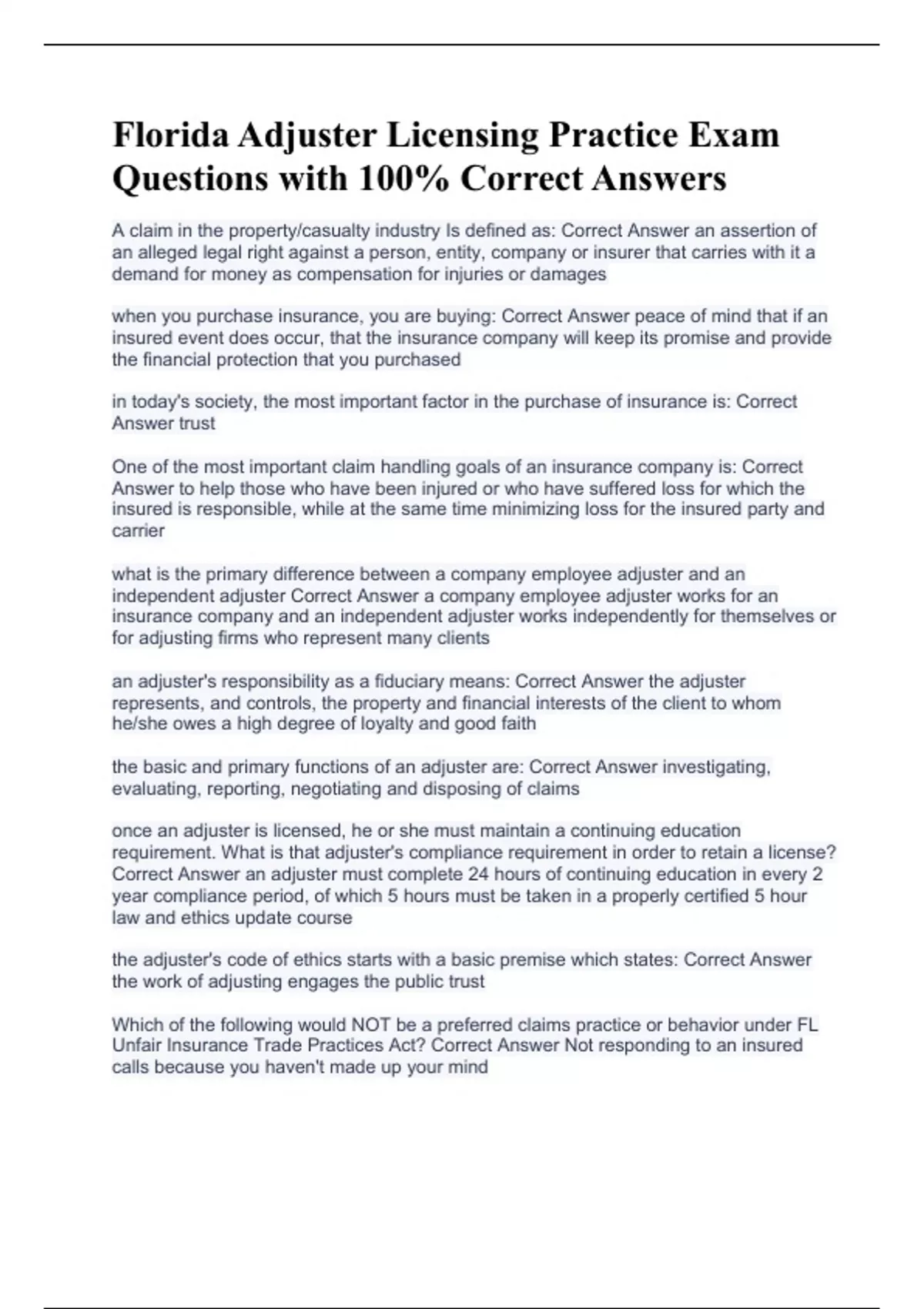 Florida Adjuster Licensing Practice Exam Questions with 100% Correct Answers