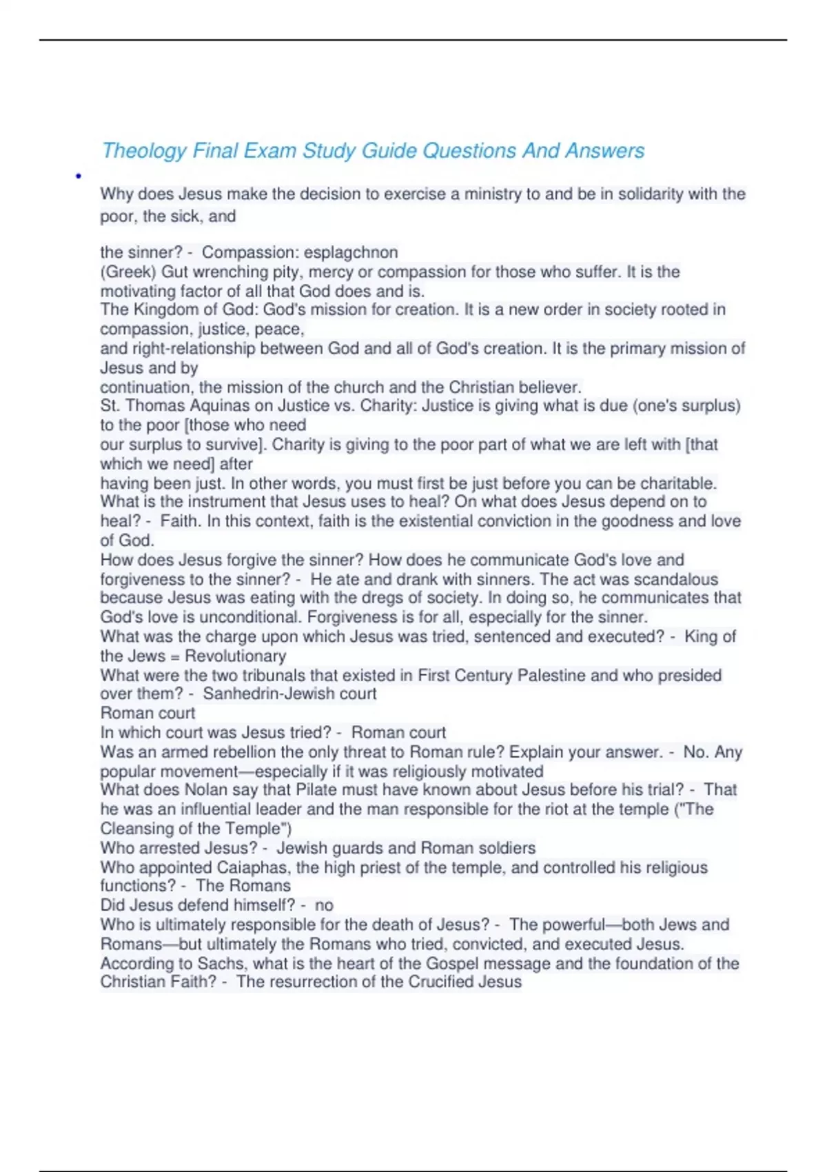 Theology Final Exam Study Guide Questions And Answers • Why does Jesus make the decision to exercise a ministry to and be in solidarity with the poor, the sick, and the sinner? - Compassion: esplagchnon (Greek) Gut wrenching pity, mercy or compassion for those who suffer. It is the motivating factor of all that God does and is. The Kingdom of God: God's mission for creation. It is a new order in society rooted in compassion, justice, peace, and right-relationship between God and all of God's creation. It is the primary mission of Jesus and by continuation, the mission of the church and the Christian believer. St. Thomas Aquinas on Justice vs. Charity: Justice is giving what is due (one's surplus) to the poor [those who need our surplus to survive]. Charity is giving to the poor part of what we are left with [that which we need] after having been just. In other words, you must first be just before you can be charitable. What is the instrument that Jesus uses to heal? On what does Jesus depend on to heal? - Faith. In this context, faith is the existential conviction in the goodness and love of God. How does Jesus forgive the sinner? How does he communicate God's love and forgiveness to the sinner? - He ate and drank with sinners. The act was scandalous because Jesus was eating with the dregs of society. In doing so, he communicates that God's love is unconditional. Forgiveness is for all, especially for the sinner. What was the charge upon which Jesus was tried, sentenced and executed? - King of the Jews = Revolutionary What were the two tribunals that existed in First Century Palestine and who presided over them? - Sanhedrin-Jewish court Roman court In which court was Jesus tried? - Roman court Was an armed rebellion the only threat to Roman rule? Explain your answer. - No. Any popular movement—especially if it was religiously motivated What does Nolan say that Pilate must have known about Jesus before his trial? - That he was an influential leader and the man responsible for the riot at the temple ("The Cleansing of the Temple") Who arrested Jesus? - Jewish guards and Roman soldiers Who appointed Caiaphas, the high priest of the temple, and controlled his religious functions? - The Romans Did Jesus defend himself? - no Who is ultimately responsible for the death of Jesus? - The powerful—both Jews and Romans—but ultimately the Romans who tried, convicted, and executed Jesus. According to Sachs, what is the heart of the Gospel message and the foundation of the Christian Faith? - The resurrection of the Crucified Jesus What is the meaning of the word "parousia"? - The imminent coming—second coming How was the general resurrection seen within the Pharisaic tradition? - It was eventually seen as the ground of hope not only for Israel's vindication, but for the apocalyptic revelation of God's mercy upon all nations. For Jesus, is the resurrection merely connected with the idea of a just retribution? Why or why not? - No. It is connected with God's faithful love How do the Gospel narratives present the death and resurrection of Jesus? - They present Jesus' death and resurrection, not as a personal privilege of Jesus, but as the culmination of God's action for us and for our salvation. What is "divine life" all about? - Life unto death for others is what divine life is all about. Sachs states that "it is the same Jesus, who died and was buried" who was now alive after the resurrection. He also holds that the resurrected Jesus was not the same. What does this m