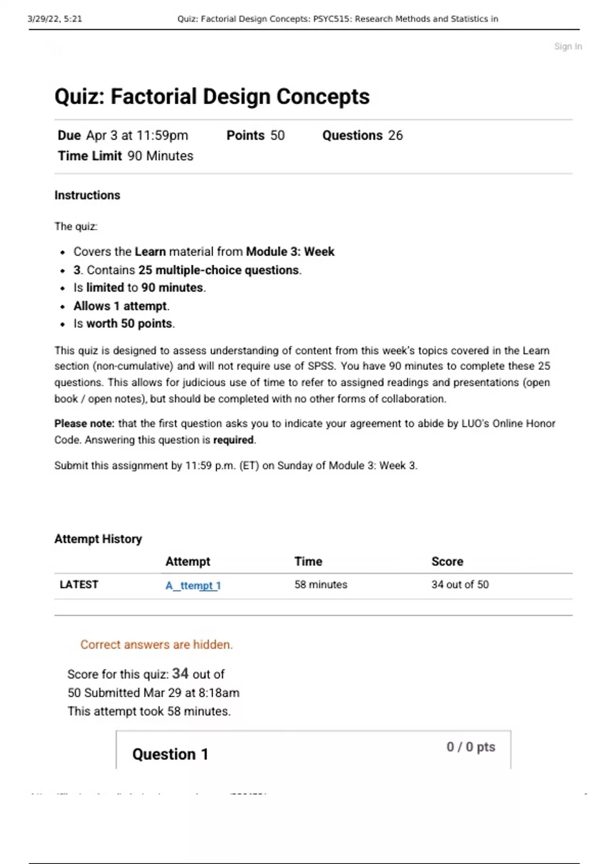 Answered Quiz: Factorial Design Concepts: PSYC515: Research Methods and Statistics in Psychology II (D01)