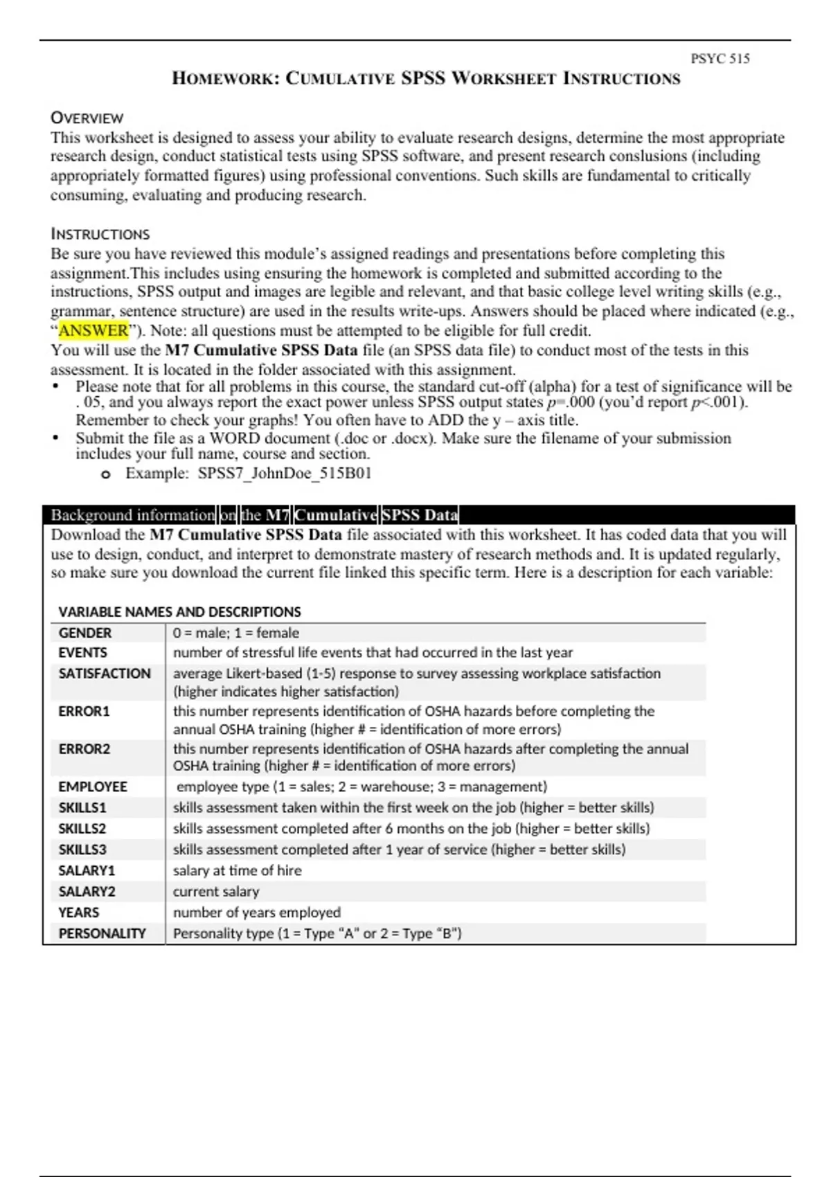 PSYC 515 HOMEWORK: CUMULATIVE SPSS WORKSHEET INSTRUCTIONS Wk 7 A1 - STONE Homework Cumulative SPSS Assignment.