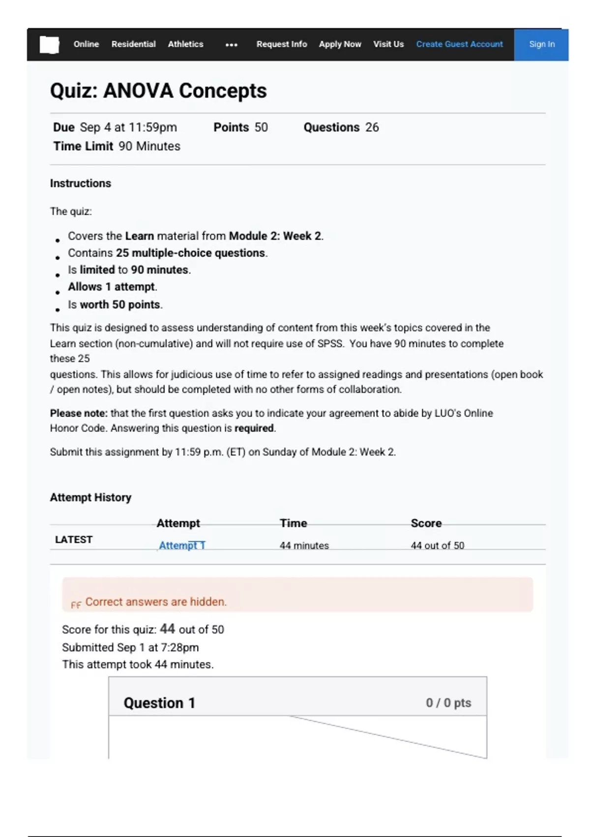 PSYC 515 Research Methods & Statistics II Week 2 - Quiz - ANOVA Concepts. Quiz: ANOVA Concepts LATEST Attempt 1 42 minutes 50 out of 50 Score for this quiz: 50 out of 50 Submitted Jul 5 at 4:43am This attempt took 42 minutes. Question 1 I have read and understand the Academic Honor policy as outlined in the Online Honor Code for Liberty University Online. I agree to abide by this policy and that the work submitted herein is my own. Yes No Question 2 2 / 2 pts Scenario: Does emotional intelligence change across the lifespan? A researcher conducts a longitudinal study by collecting data on the same people across 20 years. Emotional intelligence was quantified at ages 4, 14, 24, and 34 years of age. Emotional intelligence was quantified using the selfreport Bar-On EQ-I, which ranges from 0 — 110, and is considered