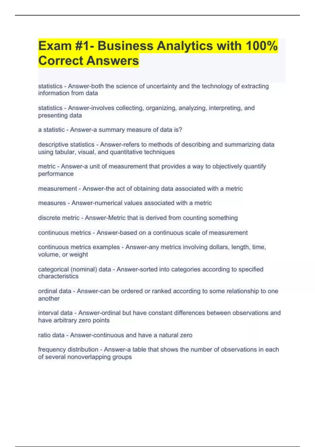 statistics - Answer-both the science of uncertainty and the technology of extracting information from data statistics - Answer-involves collecting, organizing, analyzing, interpreting, and presenting data a statistic - Answer-a summary measure of data is? descriptive statistics - Answer-refers to methods of describing and summarizing data using tabular, visual, and quantitative techniques metric - Answer-a unit of measurement that provides a way to objectively quantify performance measurement - Answer-the act of obtaining data associated with a metric measures - Answer-numerical values associated with a metric discrete metric - Answer-Metric that is derived from counting something continuous metrics - Answer-based on a continuous scale of measurement continuous metrics examples - Answer-any metrics involving dollars, length, time, volume, or weight categorical (nominal) data - Answer-sorted into categories according to specified characteristics ordinal data - Answer-can be ordered or ranked according to some relationship to one another interval data - Answer-ordinal but have constant differences between observations and have arbitrary zero points ratio data - Answer-continuous and have a natural zero frequency distribution - Answer-a table that shows the number of observations in each of several nonoverlapping groups