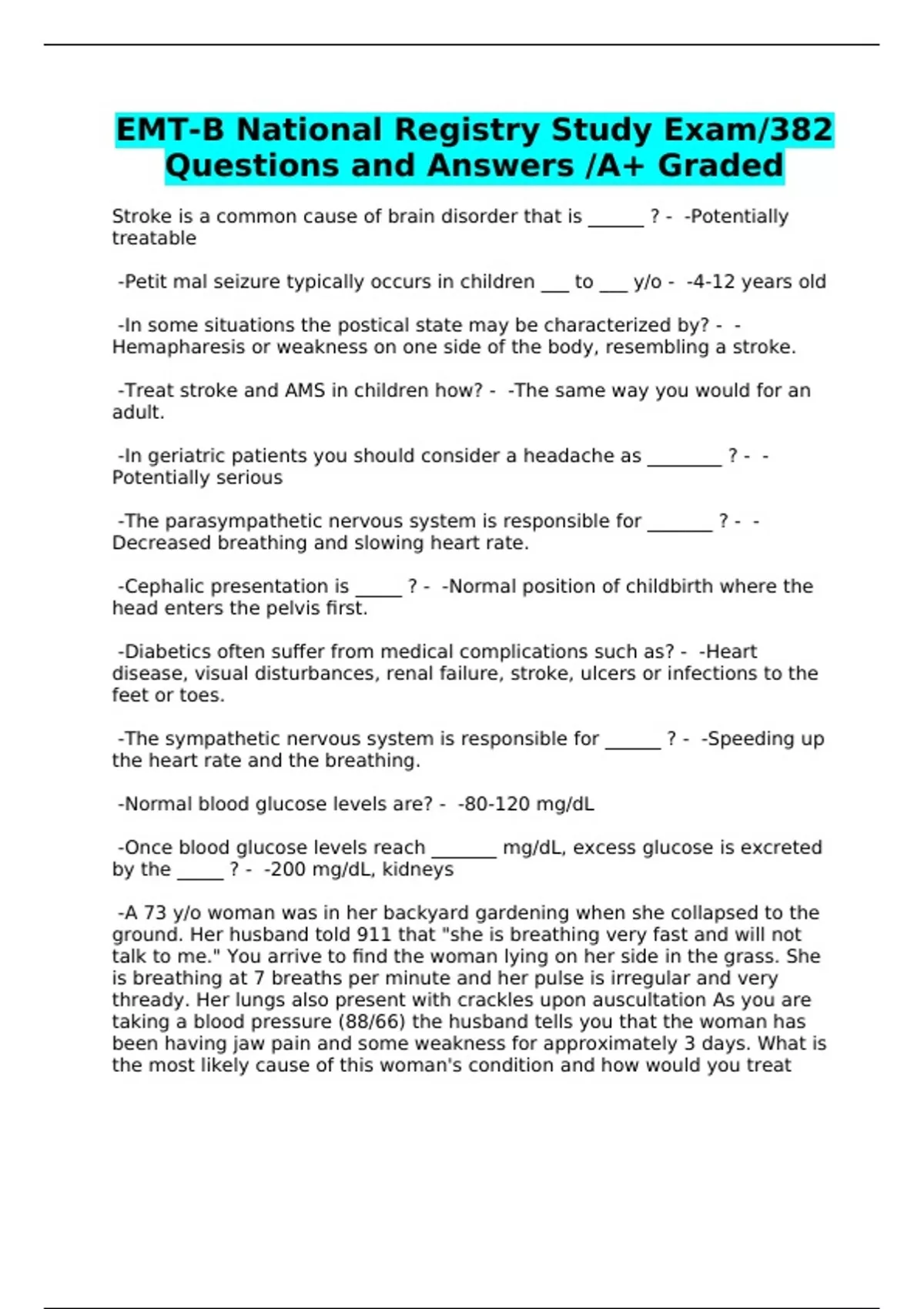 EMT-B National Registry Study Exam/382 Questions and Answers /A+ Graded