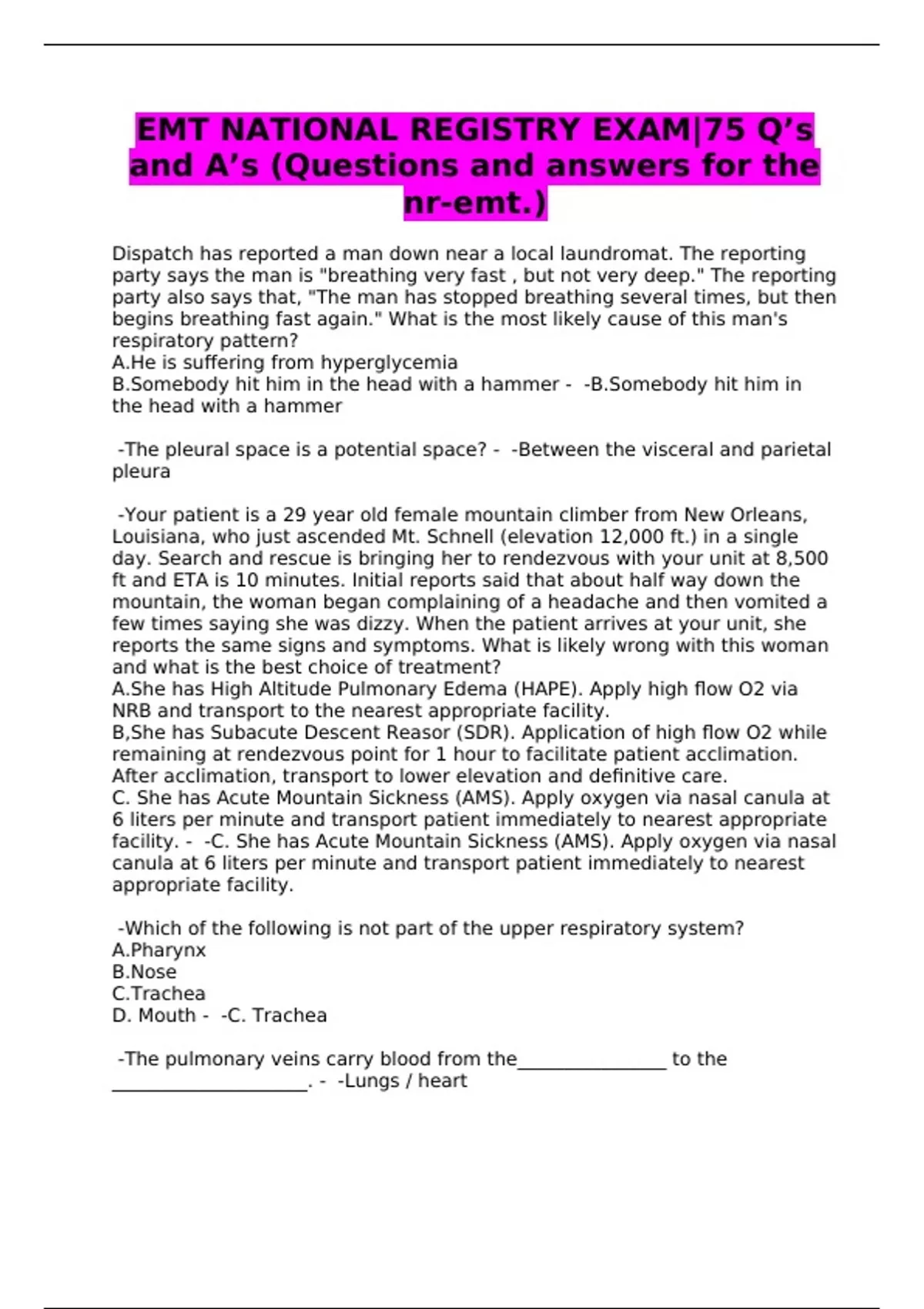 EMT NATIONAL REGISTRY EXAM|75 Q’s and A’s (Questions and answers for the nr-emt.)