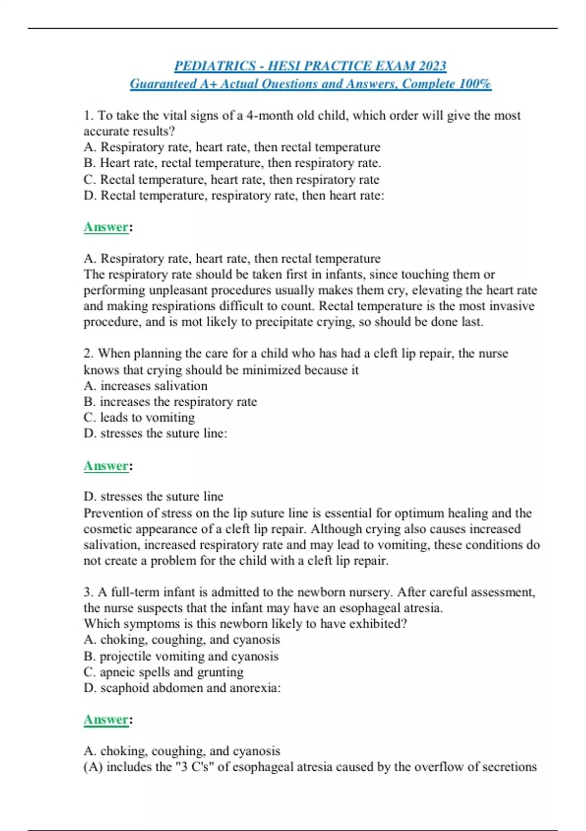 PEDIATRICS - HESI PRACTICE EXAM 2023 Guaranteed A+ Actual Questions and Answers, Complete 100% 1. To take the vital signs of a 4-month old child, which order will give the most accurate results? A. Respiratory rate, heart rate, then rectal temperature B. Heart rate, rectal temperature, then respiratory rate. C. Rectal temperature, heart rate, then respiratory rate D. Rectal temperature, respiratory rate, then heart rate: Answer: A. Respiratory rate, heart rate, then rectal temperature The respiratory rate should be taken first in infants, since touching them or performing unpleasant procedures usually makes them cry, elevating the heart rate and making respirations difficult to count. Rectal temperature is the most invasive procedure, and is mot likely to precipitate crying, so should be done last. 2. When planning the care for a child who has had a cleft lip repair, the nurse knows that crying should be minimized because it A. increases salivation B. increases the respiratory rate C. leads to vomiting D. stresses the suture line: Answer: D. stresses the suture line Prevention of stress on the lip suture line is essential for optimum healing and the cosmetic appearance of a cleft lip repair. Although crying also causes increased salivation, increased respiratory rate and may lead to vomiting, these conditions do not create a problem for the child with a cleft lip repair. 3. A full-term infant is admitted to the newborn nursery. After careful assessment, the nurse suspects that the infant may have an esophageal atresia. Which symptoms is this newborn likely to have exhibited? A. choking, coughing, and cyanosis B. projectile vomiting and cyanosis C. apneic spells and grunting D. scaphoid abdomen and anorexia: Answer: A. choking, coughing, and cyanosis (A) includes the "3 C's" of esophageal atresia caused by the overflow of secretions into the trachea. (B) is characteristic of pyloric stenosis in the infant. (C) could be due to prematurity or sepsis, and grunting is a sign of respiratory distress. (D) is characteristic of a diaphragmatic hernia.