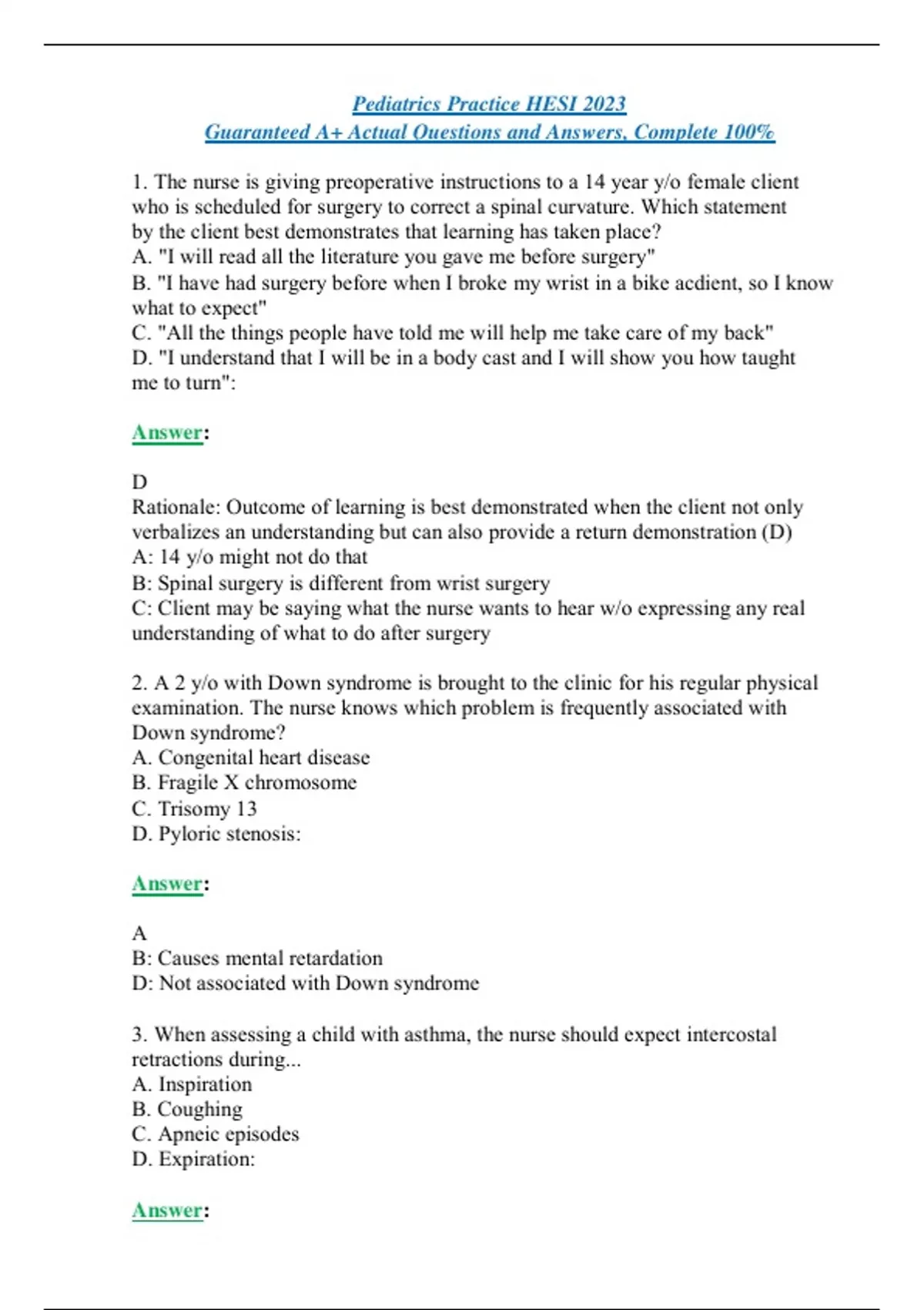 Pediatrics Practice HESI 2023 Guaranteed A+ Actual Questions and Answers, Complete 100% 1. The nurse is giving preoperative instructions to a 14 year y/o female client who is scheduled for surgery to correct a spinal curvature. Which statement by the client best demonstrates that learning has taken place? A. "I will read all the literature you gave me before surgery" B. "I have had surgery before when I broke my wrist in a bike acdient, so I know what to expect" C. "All the things people have told me will help me take care of my back" D. "I understand that I will be in a body cast and I will show you how taught me to turn": Answer: D Rationale: Outcome of learning is best demonstrated when the client not only verbalizes an understanding but can also provide a return demonstration (D) A: 14 y/o might not do that B: Spinal surgery is different from wrist surgery C: Client may be saying what the nurse wants to hear w/o expressing any real understanding of what to do after surgery 2. A 2 y/o with Down syndrome is brought to the clinic for his regular physical examination. The nurse knows which problem is frequently associated with Down syndrome? A. Congenital heart disease B. Fragile X chromosome C. Trisomy 13 D. Pyloric stenosis: Answer: A B: Causes mental retardation D: Not associated with Down syndrome 3. When assessing a child with asthma, the nurse should expect intercostal retractions during... A. Inspiration B. Coughing C. Apneic episodes D. Expiration: Answer: A. Intercostal retractions result from respiratory effort to draw air into restricted airways