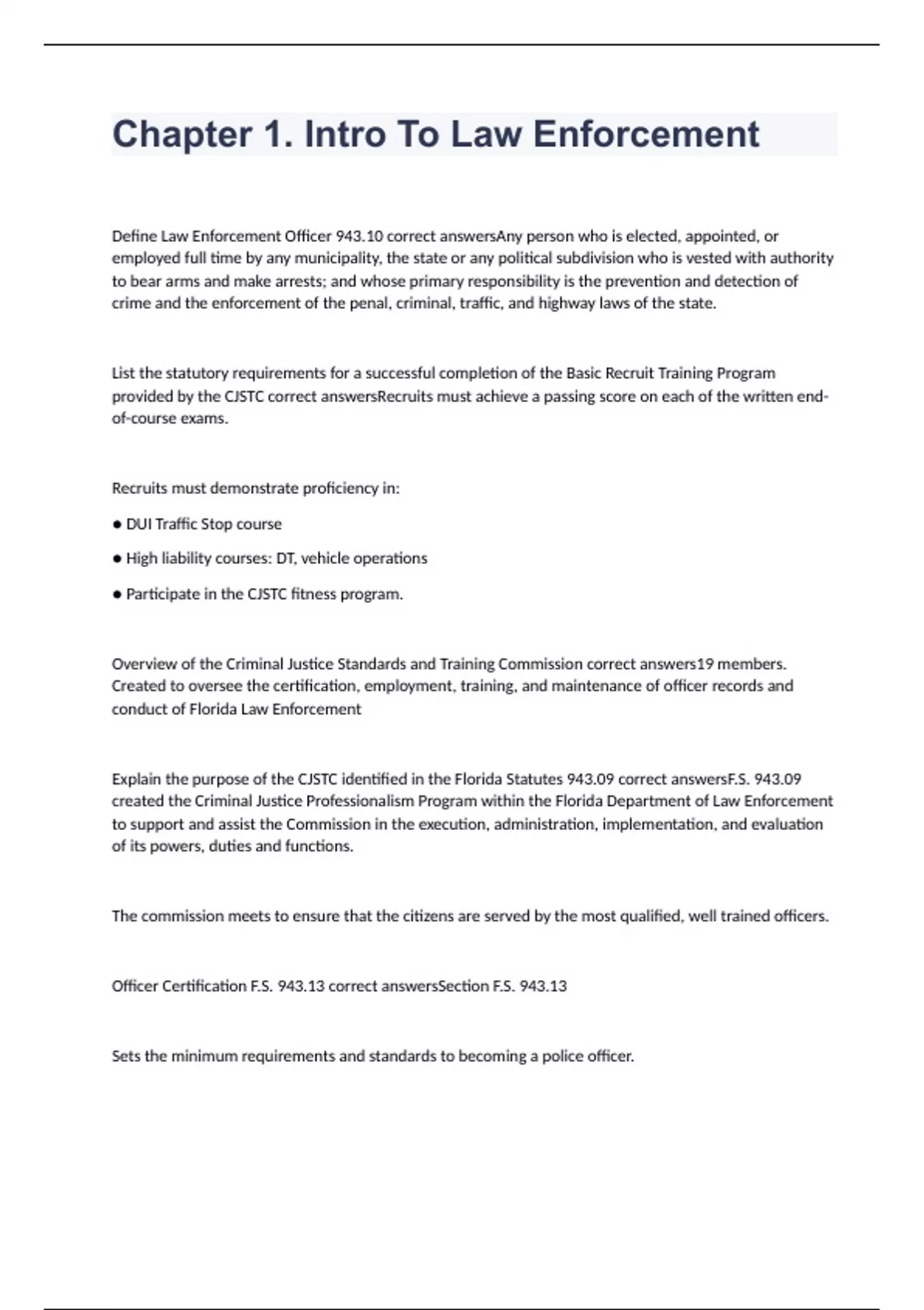 Define Law Enforcement Officer 943.10 correct answersAny person who is elected, appointed, or employed full time by any municipality, the state or any political subdivision who is vested with authority to bear arms and make arrests; and whose primary responsibility is the prevention and detection of crime and the enforcement of the penal, criminal, traffic, and highway laws of the state. List the statutory requirements for a successful completion of the Basic Recruit Training Program provided by the CJSTC correct answersRecruits must achieve a passing score on each of the written end-of-course exams. Recruits must demonstrate proficiency in: ● DUI Traffic Stop course ● High liability courses: DT, vehicle operations ● Participate in the CJSTC fitness program. Overview of the Criminal Justice Standards and Training Commission correct answers19 members. Created to oversee the certification, employment, training, and maintenance of officer records and conduct of Florida Law Enforcement Explain the purpose of the CJSTC identified in the Florida Statutes 943.09 correct answersF.S. 943.09 created the Criminal Justice Professionalism Program within the Florida Department of Law Enforcement to support and assist the Commission in the execution, administration, implementation, and evaluation of its powers, duties and functions. The commission meets to ensure that the citizens are served by the most qualified, well trained officers. Officer Certification F.S. 943.13 correct answersSection F.S. 943.13 Sets the minimum requirements and standards to becoming a police officer.