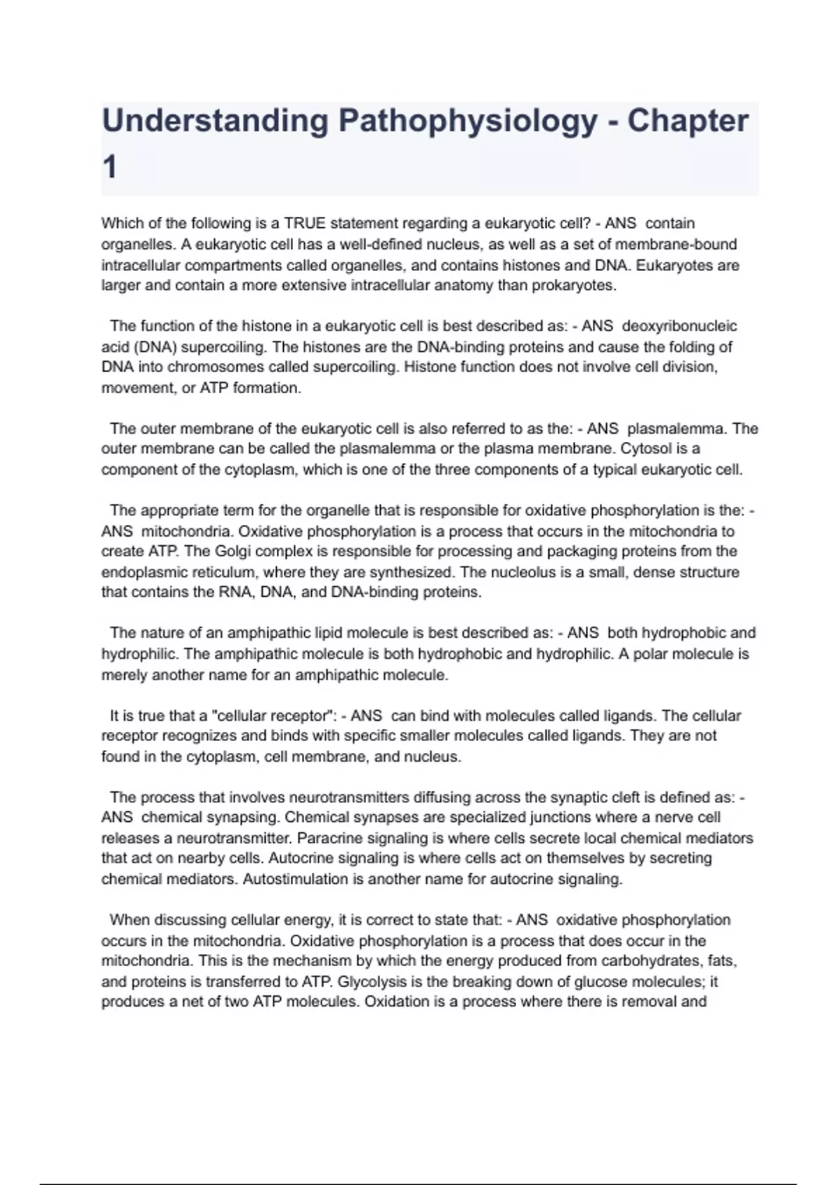 Understanding Pathophysiology - Chapter 1 Which of the following is a TRUE statement regarding a eukaryotic cell? - ANS contain organelles. A eukaryotic cell has a well-defined nucleus, as well as a set of membrane-bound intracellular compartments called organelles, and contains histones and DNA. Eukaryotes are larger and contain a more extensive intracellular anatomy than prokaryotes. The function of the histone in a eukaryotic cell is best described as: - ANS deoxyribonucleic acid (DNA) supercoiling. The histones are the DNA-binding proteins and cause the folding of DNA into chromosomes called supercoiling. Histone function does not involve cell division, movement, or ATP formation. The outer membrane of the eukaryotic cell is also referred to as the: - ANS plasmalemma. The outer membrane can be called the plasmalemma or the plasma membrane. Cytosol is a component of the cytoplasm, which is one of the three components of a typical eukaryotic cell. The appropriate term for the organelle that is responsible for oxidative phosphorylation is the: - ANS mitochondria. Oxidative phosphorylation is a process that occurs in the mitochondria to create ATP. The Golgi complex is responsible for processing and packaging proteins from the endoplasmic reticulum, where they are synthesized. The nucleolus is a small, dense structure that contains the RNA, DNA, and DNA-binding proteins.