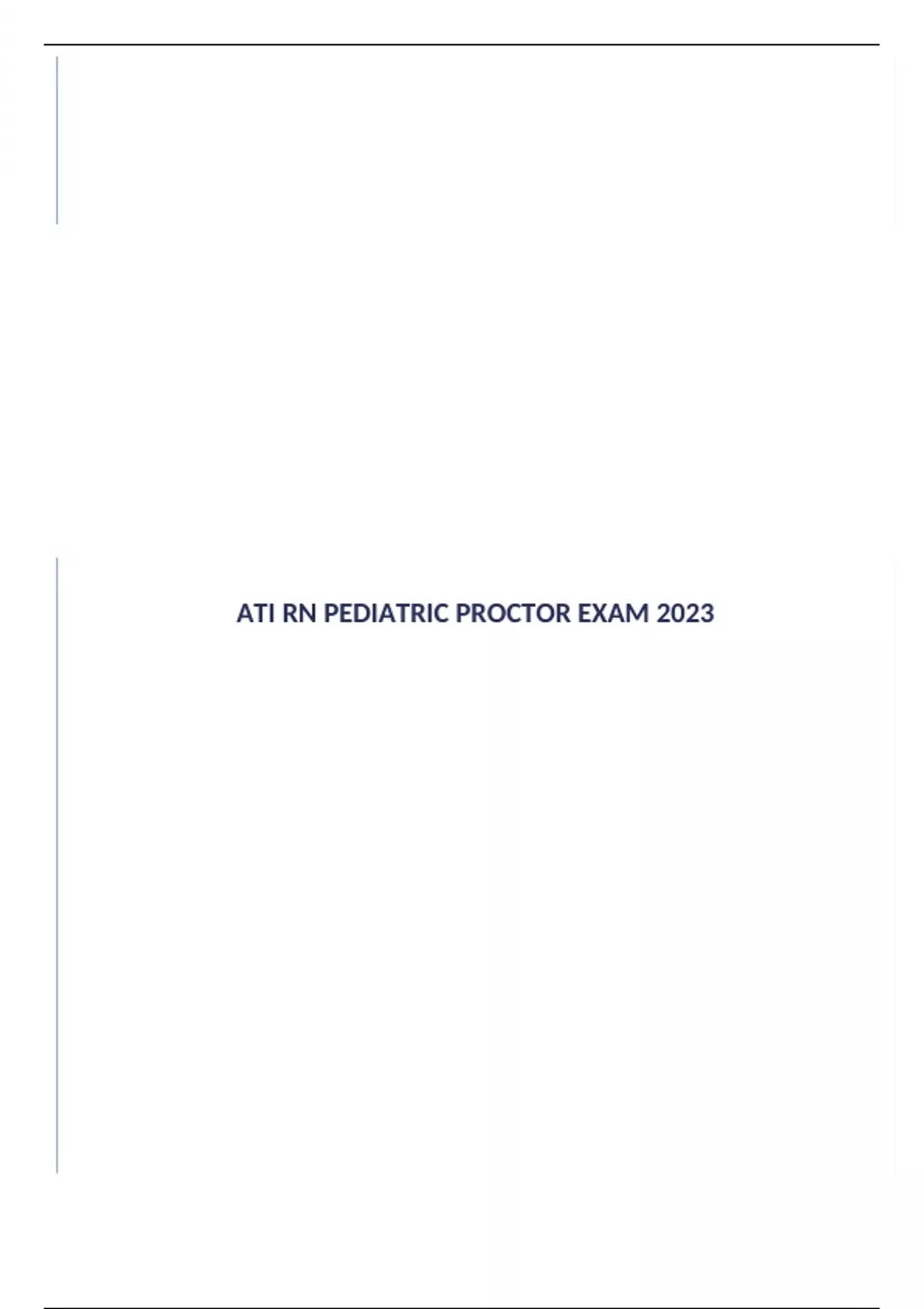 ATI RN PEDIATRIC PROCTOR EXAM 2019 1. A nurse is preparing to assess a 4-year old child’s visual acuity. Which of the following actions should the nurse plan first? • Use a tumbling E chart for the assessment • Position the child 4.6 meters (15 feet) from the chart • Assess both eyes together first, then each eye separately • Test the child without glasses before testing with glasses 2. A nurse is providing discharge teaching to a parent of a child who has juvenile idiopathic arthritis and a new prescription of prednisone/etarnecept. Which of the following statement should the nurse include in the teaching? • “Discontinue this medication if gastrointestinal upset occurs.” • “Expect that this medication will stimulate a growth spurt.” • “Limit your child’s intake of potassium-rich foods.” • “Monitor your child for indications of infection.” 3. A nurse on a pediatric unit is caring for four children. The nurse should use droplet precautions for which of the following children? • An adolescent who has hepatitis A • A toddler who has seasonal influenza • A preschool-age child who has pediculosis capitis • A school-age child who has viral conjunctivitis 4. A nurse is providing teaching to an adolescent who has vulvovaginitis. Which of the following statements should the nurse include in the teaching? • “Apply a warm, moist compress three times per day.” • “Apply scented baby powder to absorb residual moisture.” • “Wear a feminine deodorant pad for vaginal drainage.” • “Wear nylon underwear at night.” 5. A nurse is creating a plan of care for a school-age child who has nephrotic syndrome. Which of the following interventions should the nurse include? (Select all that apply) • Provide a low-sodium diet • Encourage increased fluid intake • Assess for protein in the urine • Initiate contact precautions • Obtain a daily weight 6. A nurse in a pediatric unit is caring for a school-age child following a cardiac catheterization. Which of the following interventions would the nurse take? • Maintain NPO status for 24 hrs. following the procedure • Administer meperidine for pain every 4 hrs. • Perform a sterile dressing change 8 hrs. after the procedure • Keep the affected extremity straight for 6 hrs. 7. A nurse is teaching a parent of a toddler about administering digoxin. Which of the following statements by the parent indicates understanding of the teaching? • “I should mix the medication with 4 ounces of my child’s favorite juice.” • “I should give my child water after giving the medication.” • “I should give my child another dose if he vomits right after taking the medication.” • “I should give the medication with foods that are high in fiber.” 8. A nurse is caring for a 9-year-old child who has major burns to her face and upper torso. Which of the following actions should the nurse take first? • Administer a tetanus vaccine • Give pain medication • Begin enteral feedings • Initiate a crystalloid IV bolus 9. A nurse is planning care for a toddler who has developed oral ulcers in response to chemotherapy. Which of the following should the nurse include in the plan of care? • Schedule routine oral care every 8 hrs. • Administer oral viscous lidocaine • Moisten the mucous with lemon glycerin swabs • Cleanse the gums with saline soaked gauze 10. A nurse in a community health clinic is assessing