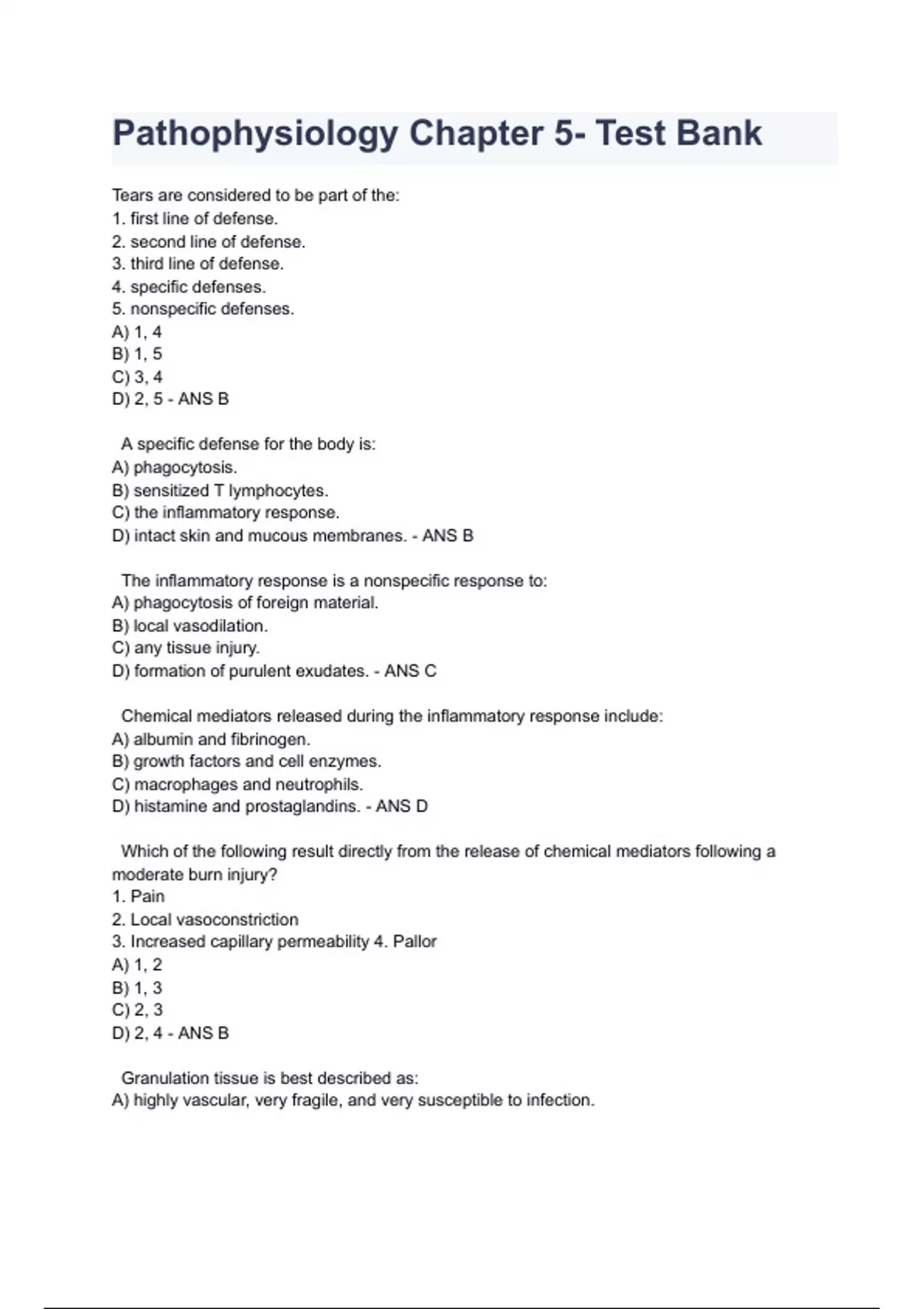 Pathophysiology Chapter 5- Test Bank Tears are considered to be part of the: 1. first line of defense. 2. second line of defense. 3. third line of defense. 4. specific defenses. 5. nonspecific defenses. A) 1, 4 B) 1, 5 C) 3, 4 D) 2, 5 - ANS B A specific defense for the body is: A) phagocytosis. B) sensitized T lymphocytes. C) the inflammatory response. D) intact skin and mucous membranes. - ANS B The inflammatory response is a nonspecific response to: A) phagocytosis of foreign material. B) local vasodilation. C) any tissue injury. D) formation of purulent exudates. - ANS C Chemical mediators released during the inflammatory response include: A) albumin and fibrinogen. B) growth factors and cell enzymes. C) macrophages and neutrophils. D) histamine and prostaglandins. - ANS D Which of the following result directly from the release of chemical mediators following a moderate burn injury? 1. Pain 2. Local vasoconstriction 3. Increased capillary permeability 4. Pallor A) 1, 2 B) 1, 3 C) 2, 3 D) 2, 4 - ANS B Granulation tissue is best described as: A) highly vascular, very fragile, and very susceptible to infection. B) an erosion through the wall of viscera, leading to complications. C) a type of adhesion with no vascularization. D) a form of stenosis, in a duct, that is extremely tough and resists attack by microbes. - ANS A Edema associated with inflammation results directly from: A) increased fluid and protein in the interstitial compartment. B) increased phagocytes in the affected area. C) decreased capillary permeability. D) general vasoconstriction. - ANS A The warmth and redness related to the inflammatory response results from: A) increased interstitial fluid. B) production of complement. C) a large number of white blood cells (WBCs) entering the area. D) increased blood flow into the area. - ANS D